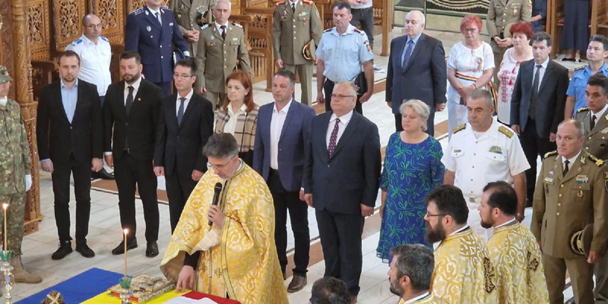 • evenimentele s-au desfășurat la Catedrala ”Nașterea Domnului” din municipiu și în Piața Independenței • programul activităților a cuprins sfințirea Drapelului României de către un sobor de preoți, ceremonialul militar – religios, precum și rostirea unui discurs de către prefectul județului