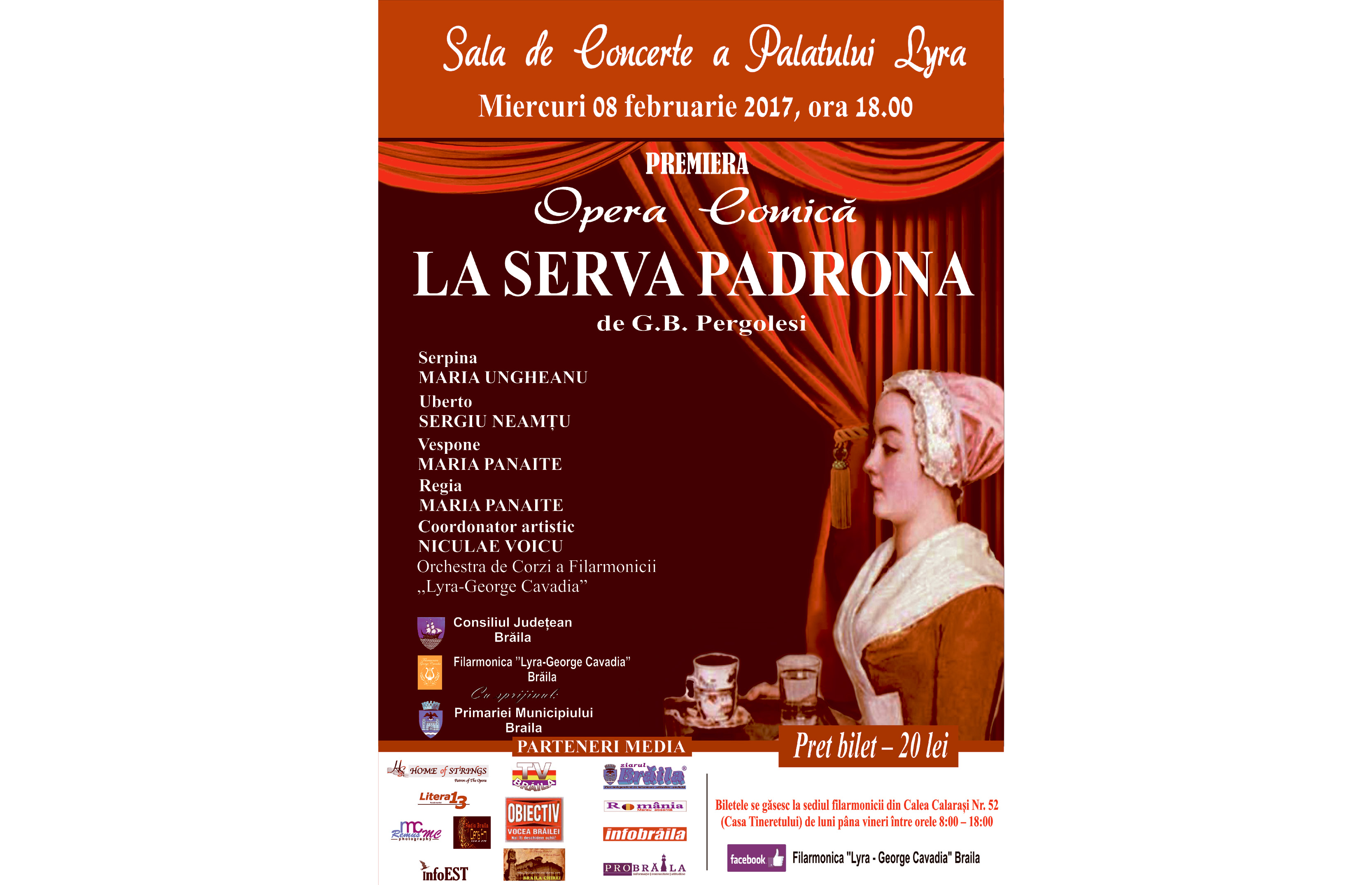 Miercuri, 8 februarie, începând cu orele 18:00, la Sala de Concerte a Palatului Lyra va avea loc premiera operei comice “La Serva Padrona” de G.B.Pergolesi. Manifestarea este organizată de Filarmonica “Lyra-George Cavadia” Brăila, Consiliul Judeţean, cu sprijinul Primăriei Municipiului Brăila,
