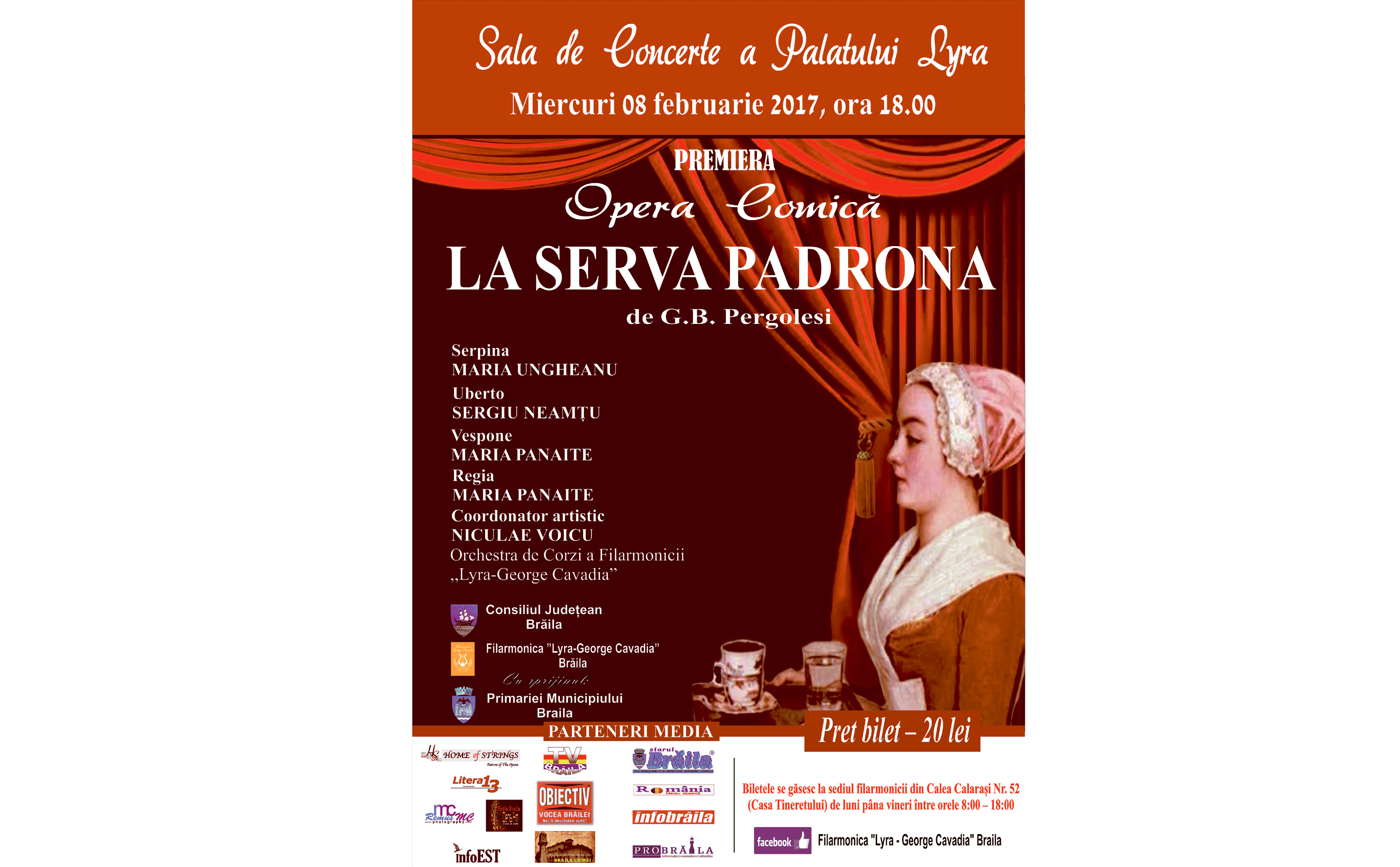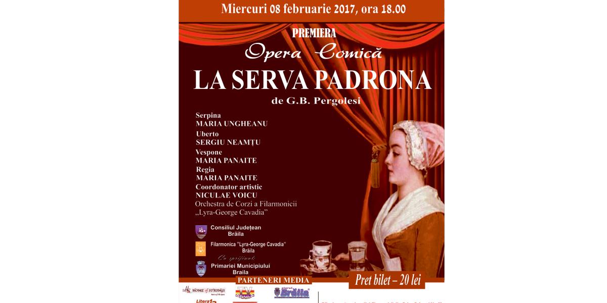 Miercuri, 8 februarie, de la orele 18:00, iubitorii muzicii clasice sunt aşteptaţi la Sala de Concerte a Palatului Lyra, unde va avea loc premiera operei comice “La Serva Padrona” de G.B. Pergolesi.
