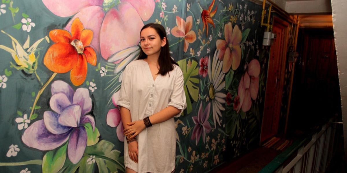 Etajul 8 al unei scări de bloc de pe strada Aleea Cocorilor, cartierul Viziru. Imediat ce ieşi pe uşa liftului, în faţa ta se aşterne o “explozie” de culoare. De sus până jos pereţii sunt “îmbrăcaţi” în flori, formând un peisaj superb care îţi induce o stare de linişte şi relaxare. Urcăm un etaj mai sus. Şi aici pereţii au prins viaţă, banalul var alb fiind acoperit acum cu floricele pictate cu măiestrie. Autoarea acestor minunăţii este Andreea Gabriela Tudor, o adoloscentă de 16 ani din Brăila, elevă încă din clasa I la Liceul de Arte “Hariclea Darclee”.