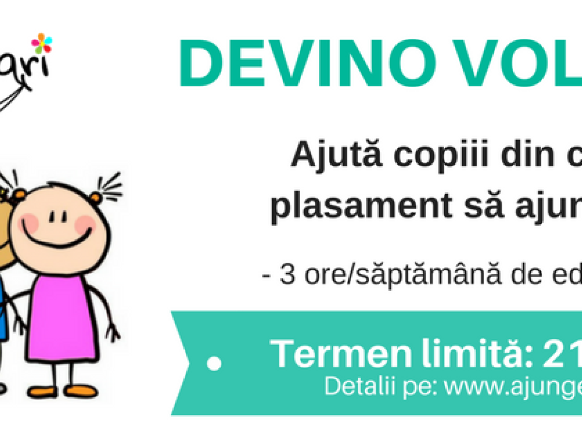 Înscrieri în proiectul “Ajungem mari” se mai fac până pe data de 21 ianuarie, la adresa https://goo.gl/jAgKxs. Mai multe detalii și pașii de înscriere găsiți pe site-ul: http://www.ajungemmari.ro/devino-voluntar/.
