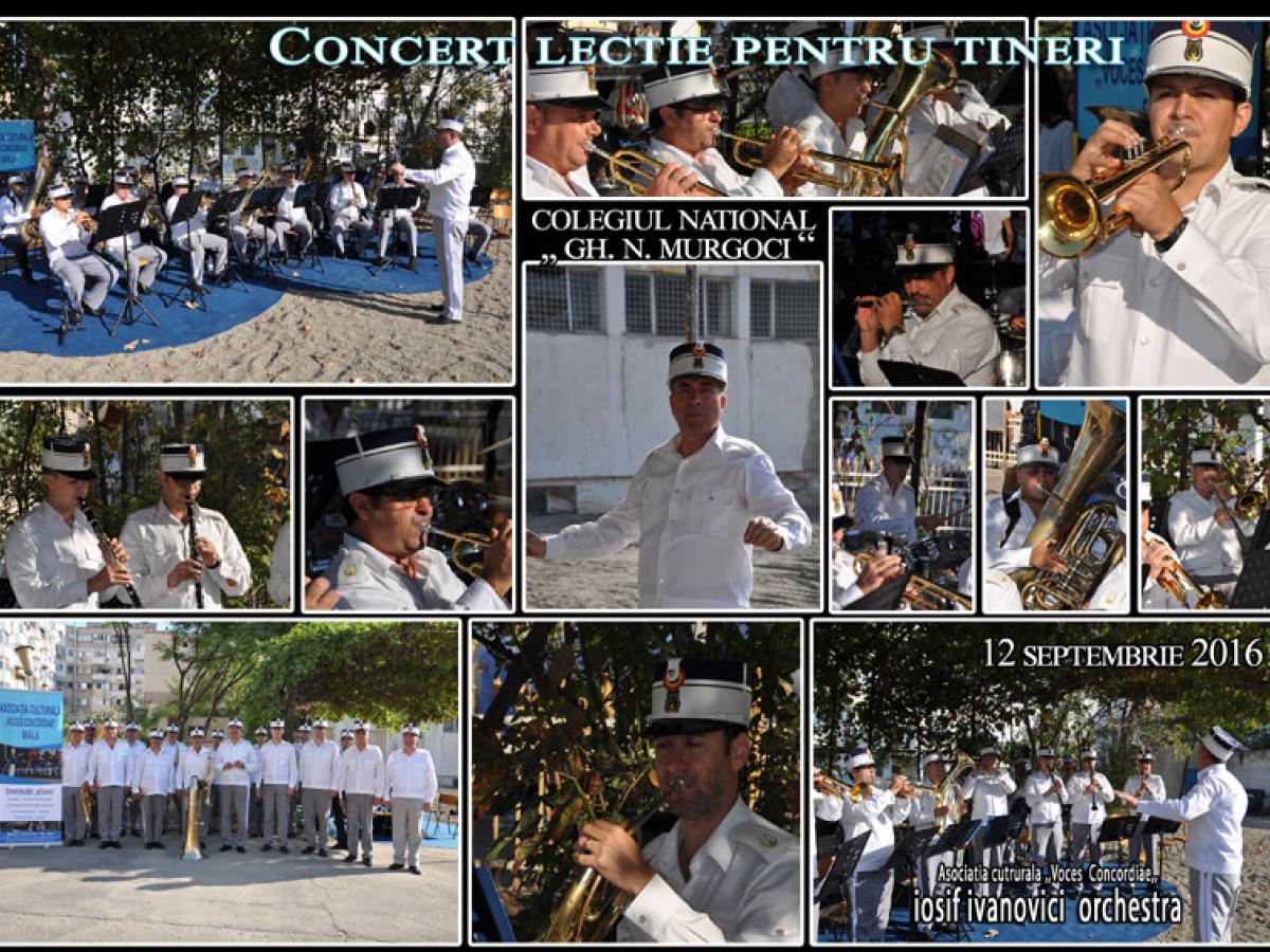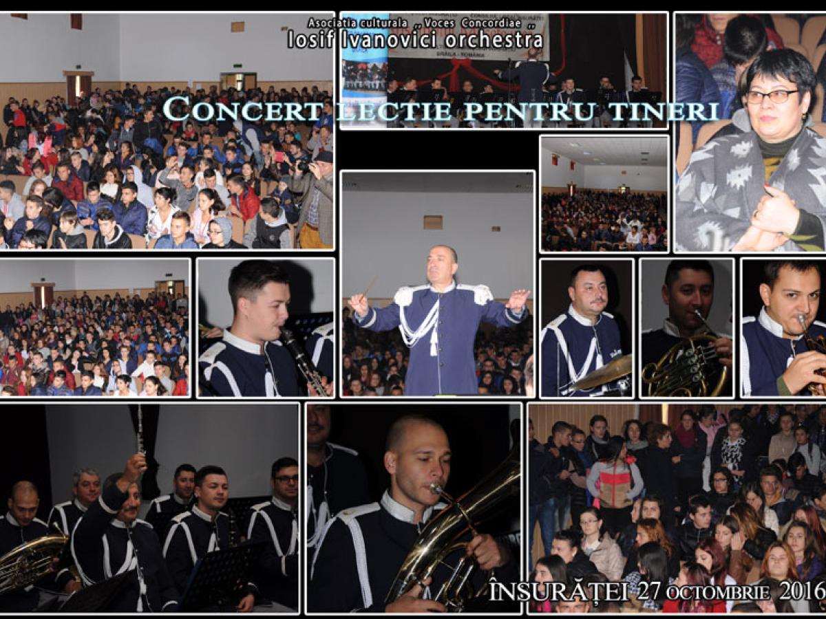 În zilele de 26 şi 27 octombrie 2016, orchestra de suflători „Iosif Ivanovici” a susţinut ultimele trei concerte în oraşele Ianca, Făurei şi Însurăţei, în cadrul proiectului „Concert lecţie pentru tineri”, finanţat de Consiliul Judeţean Brăila din fondurile alocate prin „Programul pentru finanţare nerambursabilă a activităţilor nonprofit de interes judeţean-cultură, sport pentru anul 2016” şi implementat de Asociaţia Culturală „Voces Concordiae” Brăila.