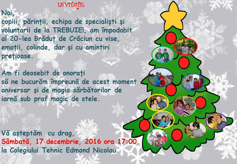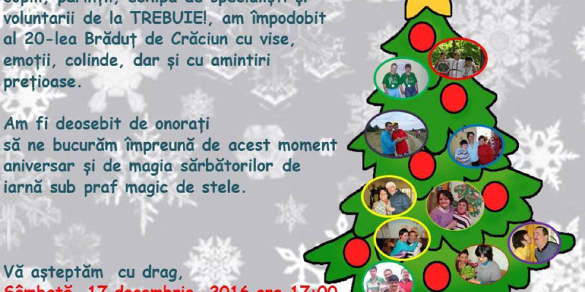 De la ora 17.00, copiii, părinţii şi specialiştii de la TREBUIE vor împodobi cel de-al 20-lea brăduţ de Crăciun cu vise, emoţii, colinde, dar şi cu amintiri preţioase. La ceas aniversar, se vor bucura împreună de magia sărbătorilor de iarnă sub praf magic de stele.