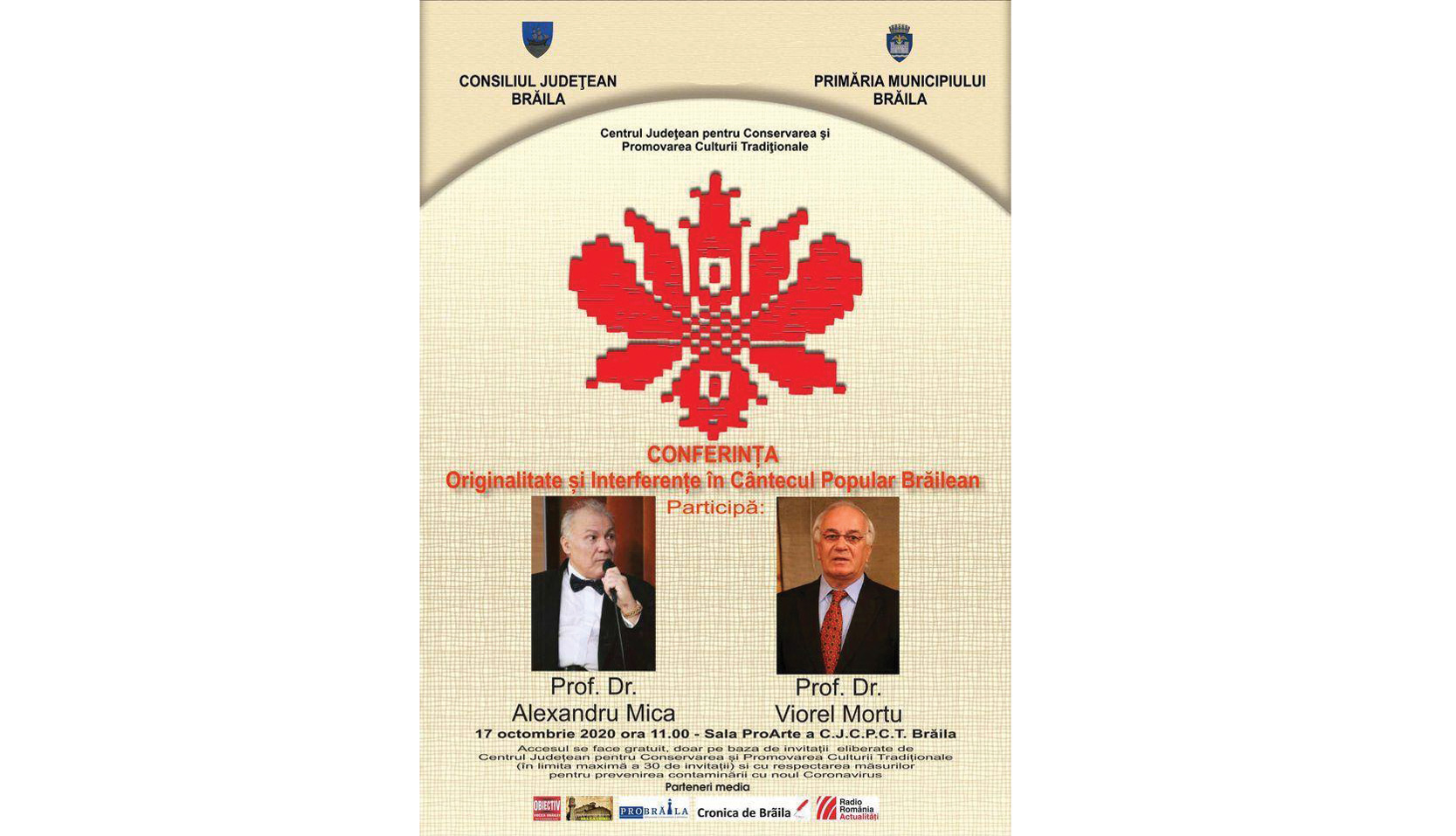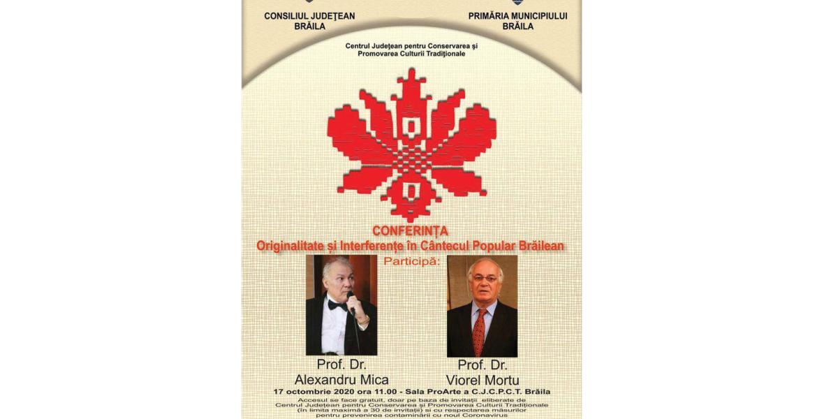Sâmbătă, 17 octombrie 2020, de la ora 11.00, în Sala Pro Arte a Centrului Judeţean pentru Conservarea şi Promovarea Culturii Tradiţionale Brăila se va desfăşura Conferinţa Originalitate şi Interferenţe în Cântecul Popular Brăilean.