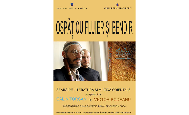 Vineri, 18 noiembrie 2016, ora 17,00, la Casa Memorială „Panait Istrati” din Grădina Publică, va avea loc o seară de literatură şi muzică orientală, susţinută de Călin Torsan şi Victor Podeanu, care vor interpreta câteva fragmente inspirate din romanul Ospăţul, scris de Călin Torsan, la instrumente de suflat şi percuţie.