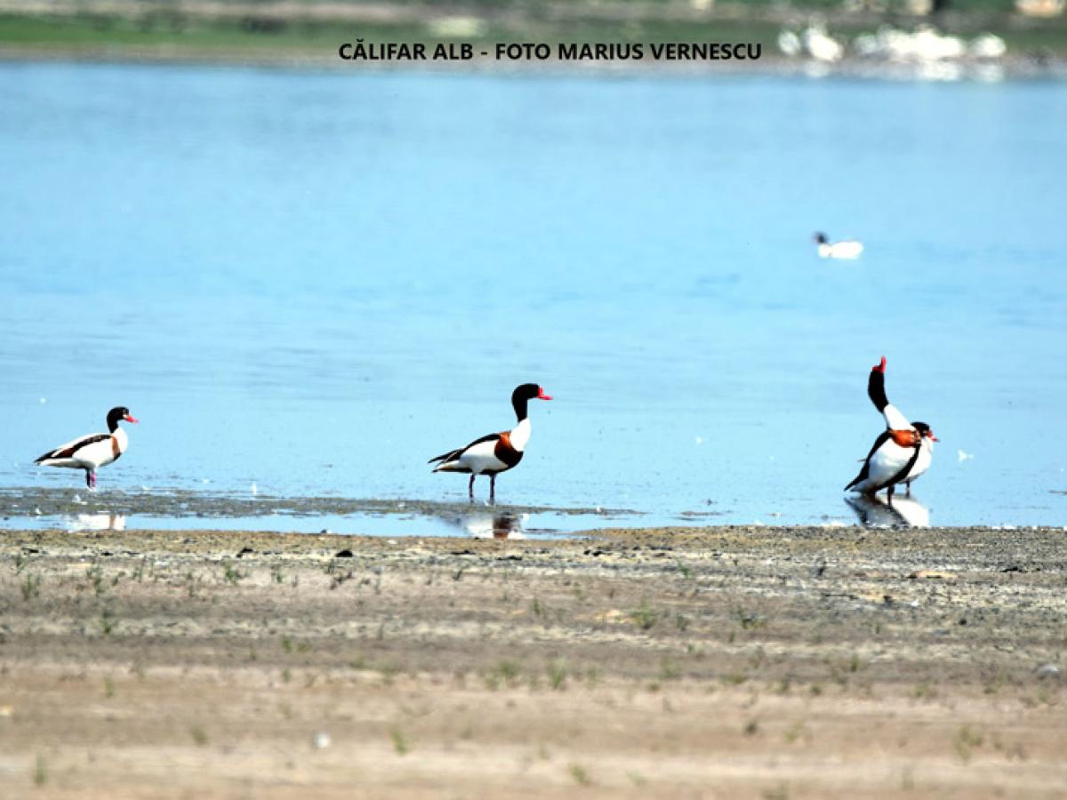 Călifar alb (Tadorna tadorna): Specia este întâlnită în zone umede, lacuri artificiale, cariere de nisip și pietriș din albia râurilor și zone costiere. Este de mărimea unei rațe mari, asemănătoare unei gâște mici ca formă a corpului, lungimea corpului fiind de 55-65 cm, anvergura aripilor de 100-120 cm, iar greutatea corpului de 1000 g (femelă) și 1200 g (masculul). Corpul este alb cu bandă cărămizie pe piept, capul și gâtul verzui închis cu pete negre pe spate și aripi și abdomenul negru. Ciocul este roșu și picioarele roz. Masculii și femelele sunt similare, dar masculul prezintă un cucui între baza ciocului și frunte în sezonul de vară. Se hrănește cu insecte, moluște și crustacei. Longevitatea în sălbăticie este de 10 ani.
