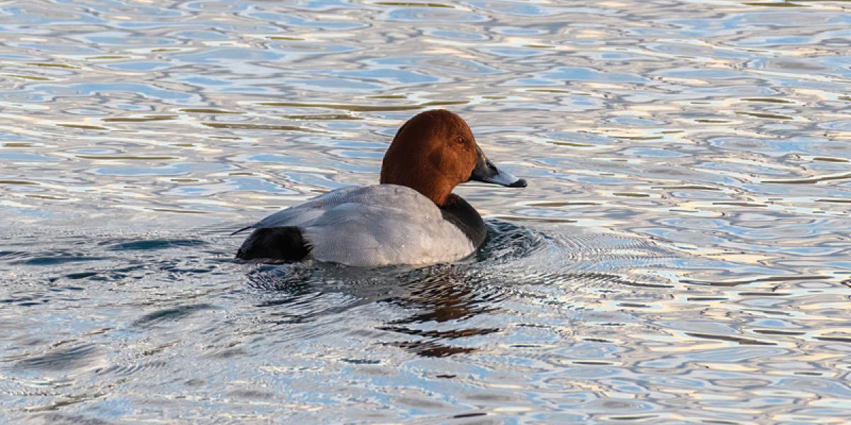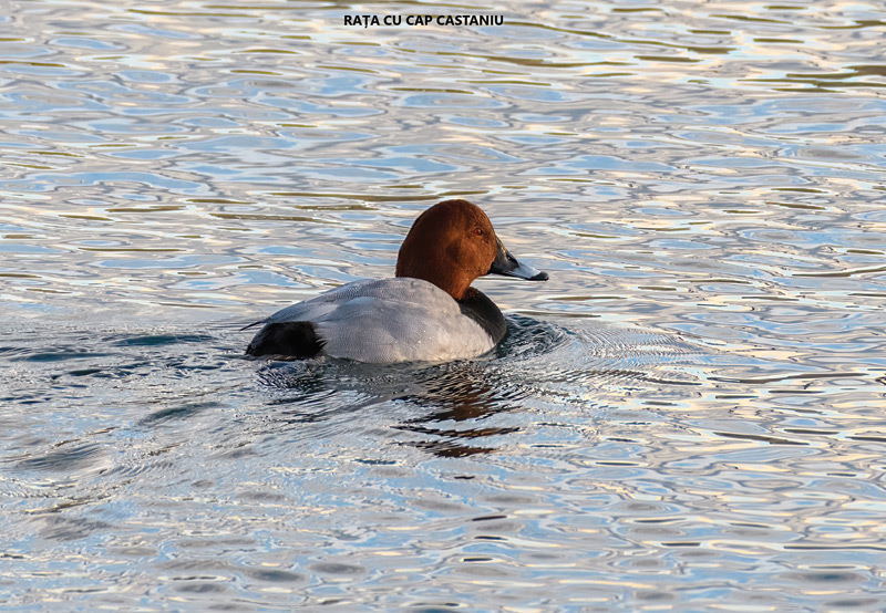 Rața cu cap castaniu (Aythya ferina): Este o specie de rață de talie medie ce prezintă dimorfism sexual. Masculul în penaj nupțial are capul de culoare castanie, pieptul, ceafa, coada, târtița și subcodalele de culoare neagră, iar spatele, abdomenul și aripile sunt de culoare gri cu vermiculații.