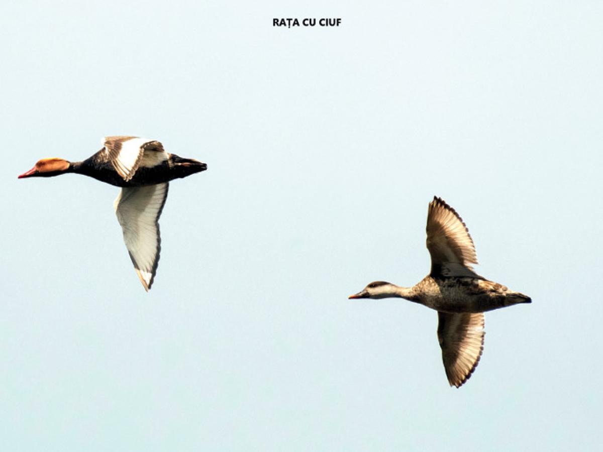 Rața cu ciuf (Netta rufina): Specie des întâlnită în România și în restul Europei, rața cu ciuf preferă habitatele cu apă salmastră și lacurile cu stufăriș. Masculul are culori relativ strălucitoare, flancurile corpului sunt de un alb lucitor, iar capul este maro-gălbui cu penele creștetului în formă de creastă erectibilă. Ciocul este de culoare roșie.