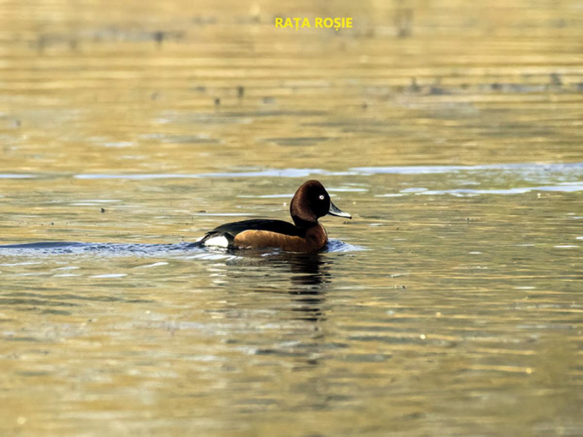 Rața roșie (Aythya nyroca): Este o specie de rață de talie medie. Ca la toate speciile de rațe, există dimorfism sexual, însă este mai puțin accentuat. Ambele sexe au colorit general maroniu, cu spatele contrastant mai închis la culoare decât flancurile sau abdomenul. În România, specia cuibărește în toate regiunile mai joase ale țării, din Delta Dunării până în zonele de deal, în regiuni cu zone umede întinse de lacuri cu vegetație acvatică bogată.