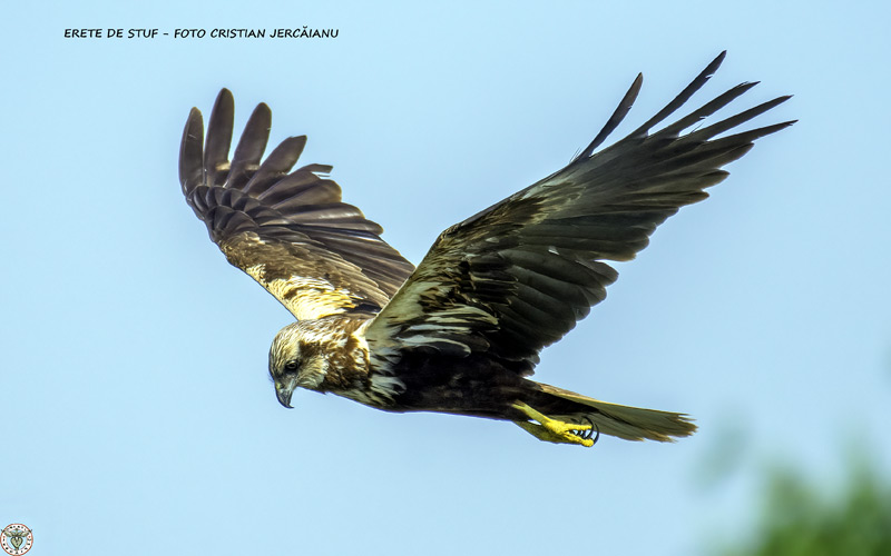 Erete sur (Circus pygargus) - Pasăre răpitoare de talie medie, cu siluetă tipică ereților: coadă și aripi lungi, zbor jos, cu aripi ridicate în formă de ”V” când planează; aripile sunt relativ mai lungi și mai înguste decât la restul speciilor de ereți.