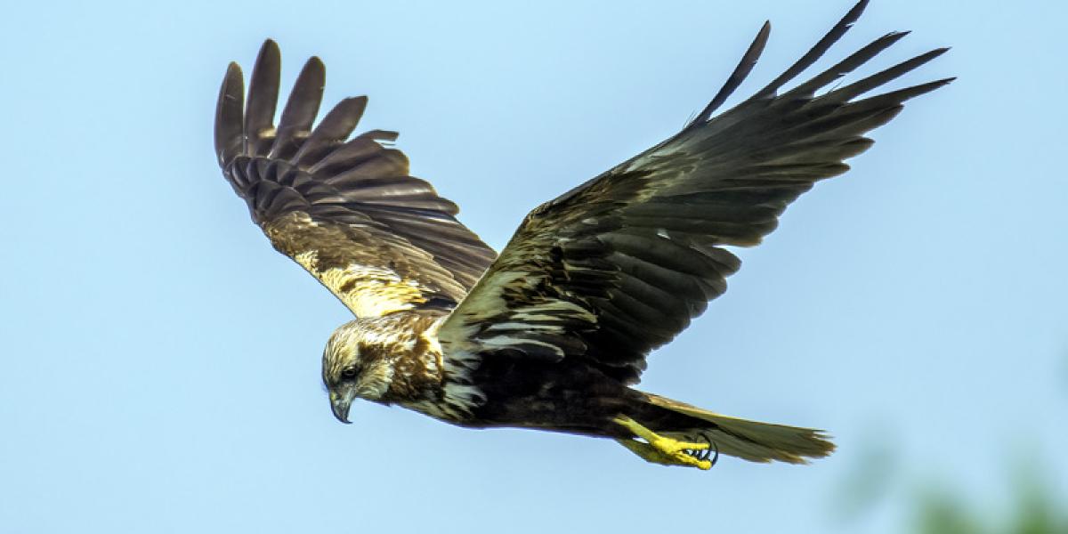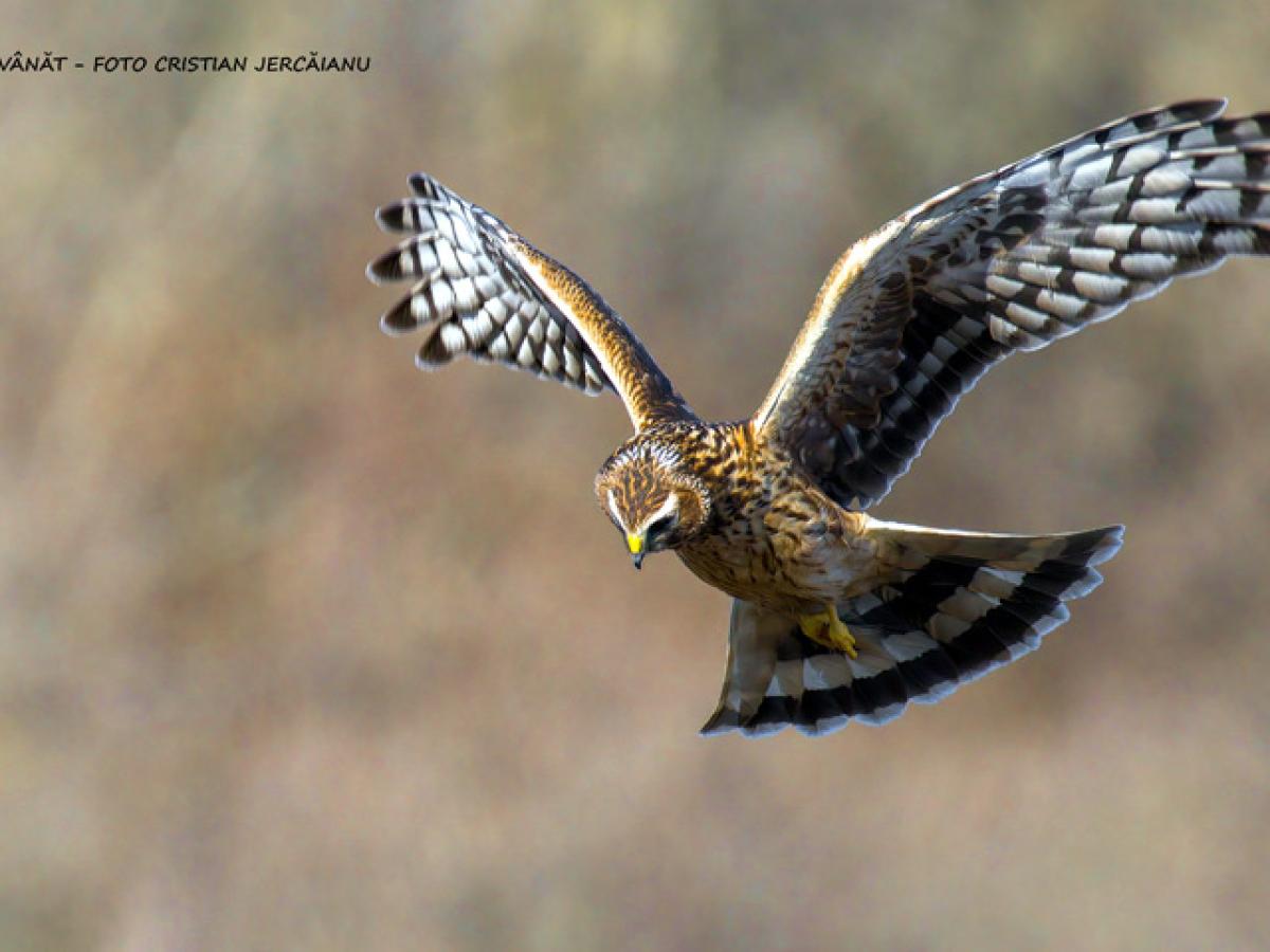 Erete vânăt (Circus cyaneus) - Pasăre răpitoare de talie medie, cu siluetă tipică ereților: coadă și aripi lungi, zbor jos, cu aripi ridicate în formă de ”V” când planează.