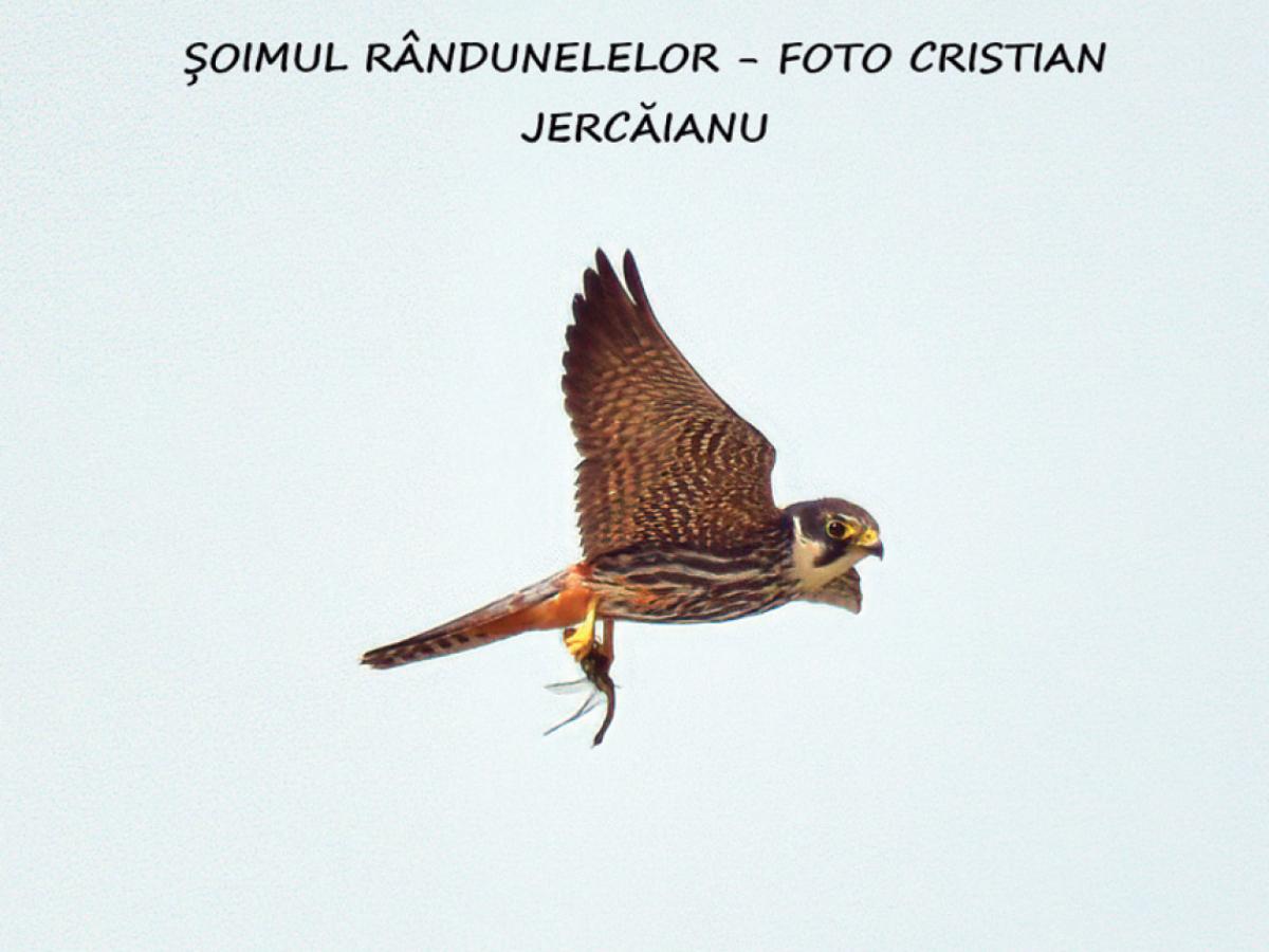 Șoimul rândunelelor (Falco subbuteo) - Pasăre răpitoare (șoim) de talie medie. Sexele au coloritul similar, dorsal fiind gri închis albăstrui; ventral este alb, cu pete dense longitudinale, negre. Caracteristic, jumătatea inferioară a abdomenului este roșie.