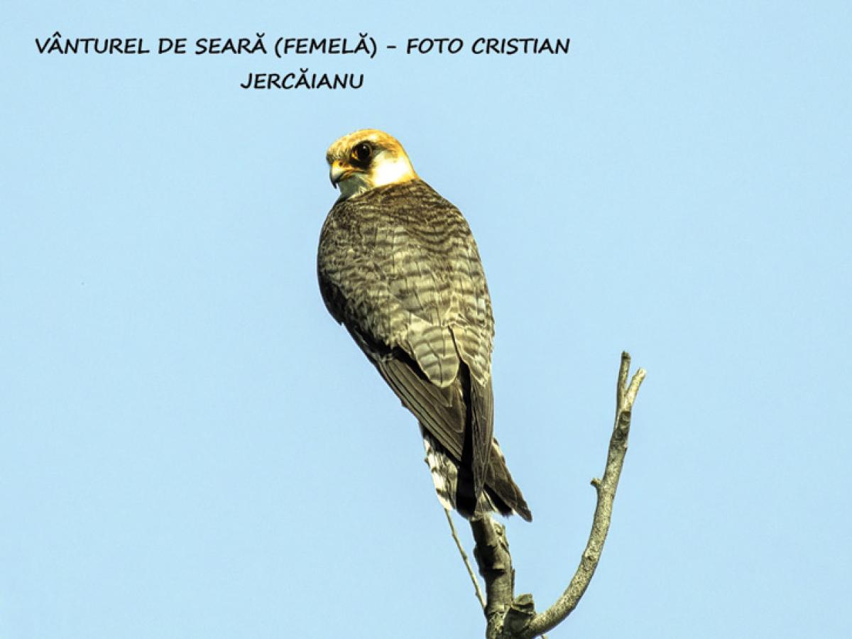 Vânturel de seară (Falco vespertinus) - Pasăre răpitoare de talie mică. Dimorfismul sexual este accentuat. Masculul are colorit general gri-albăstrui închis, partea inferioară a abdomenului, subcodalele și picioarele sunt portocaliu intens. Femela are spatele gri-albăstrui mai deschis, cu pete negre, iar capul, pieptul și burta portocaliu deschis cu puncte negre.