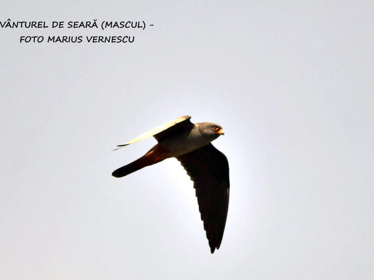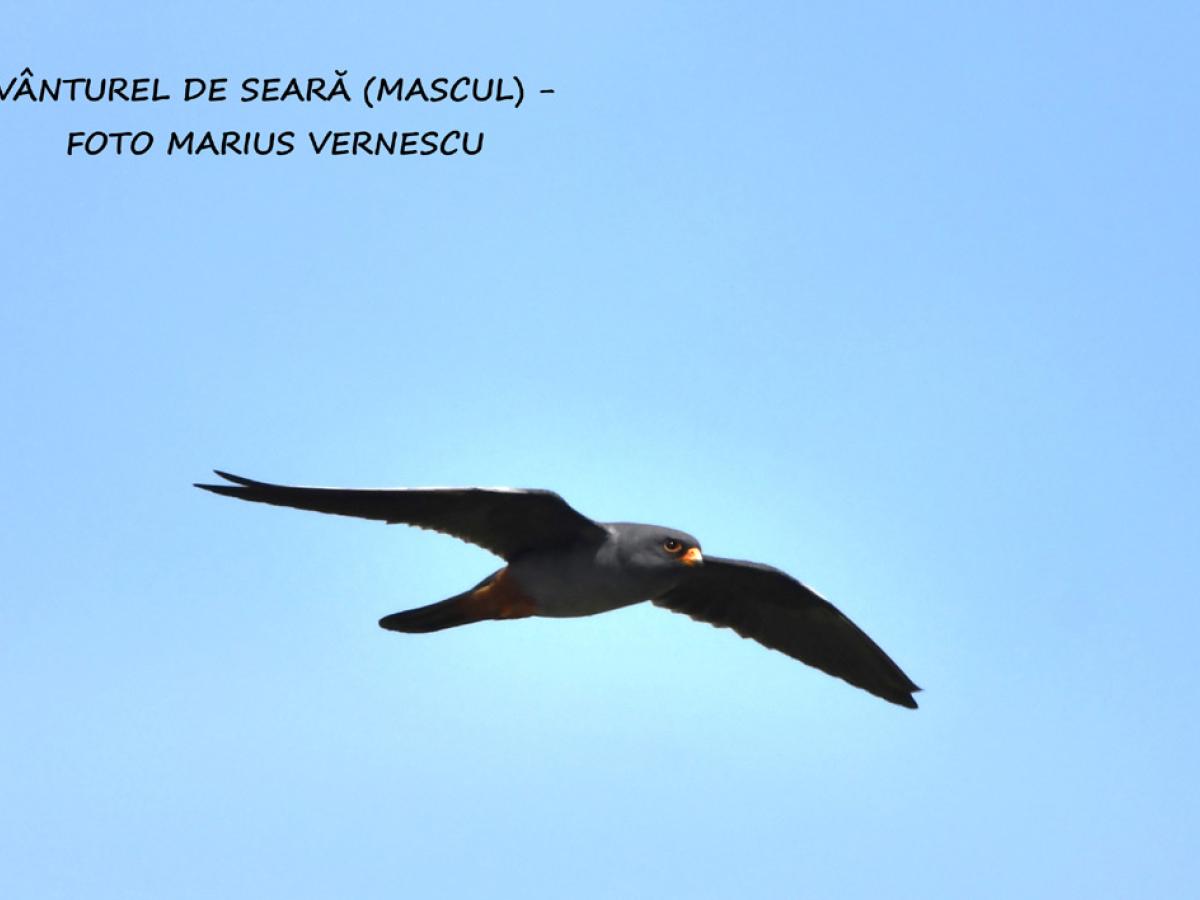 Vânturel de seară (Falco vespertinus) - Pasăre răpitoare de talie mică. Dimorfismul sexual este accentuat. Masculul are colorit general gri-albăstrui închis, partea inferioară a abdomenului, subcodalele și picioarele sunt portocaliu intens. Femela are spatele gri-albăstrui mai deschis, cu pete negre, iar capul, pieptul și burta portocaliu deschis cu puncte negre.