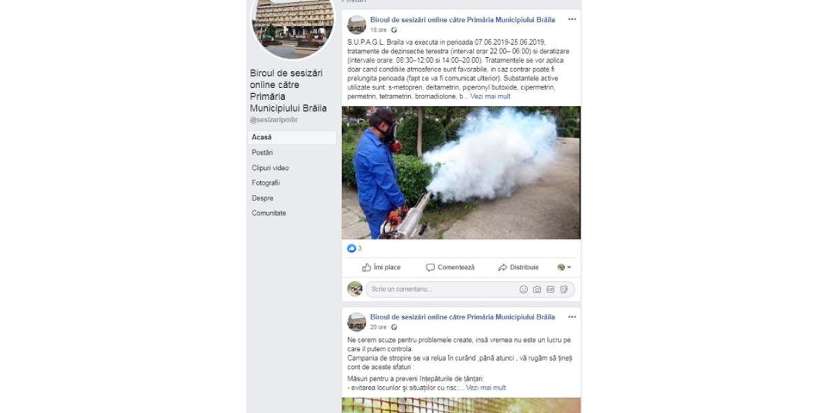 De ceva vreme, pe Facebook a fost înfiinţată o pagină unde utilizatorii ce locuiesc în municipiul Brăila sunt încurajaţi să semnaleze problemele întâlnite în oraş. Fotografia de profil ilustrează Palatul Administrativ. Prima postare figurează din luna martie a acestui an, iar cele mai recente din cursul acestei săptămâni. Ultimele teme abordate sunt cele ale aplicării tratamentelor împotriva ţânţarilor şi străzile inundate din municipiu, în urma ploilor recente.