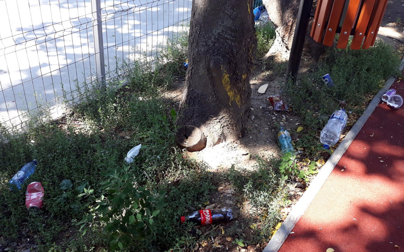 “Pentru prima dată după amenajare, acest parc arată ca după furtună, deşi nu a bătut nicio pală de vânt. Pet-uri, doze, ambalaje peste tot. Mai mult, covorul anti-traumă este plin de corcoduşe, copiii calcă pe ele. Până după-amiază o să miroasă a ţuică proaspătă,” a mai concluzionat doamna în mesajul trimis.