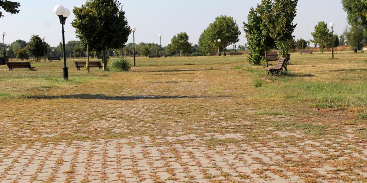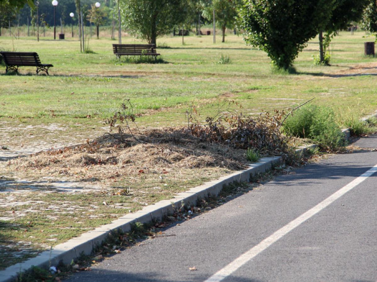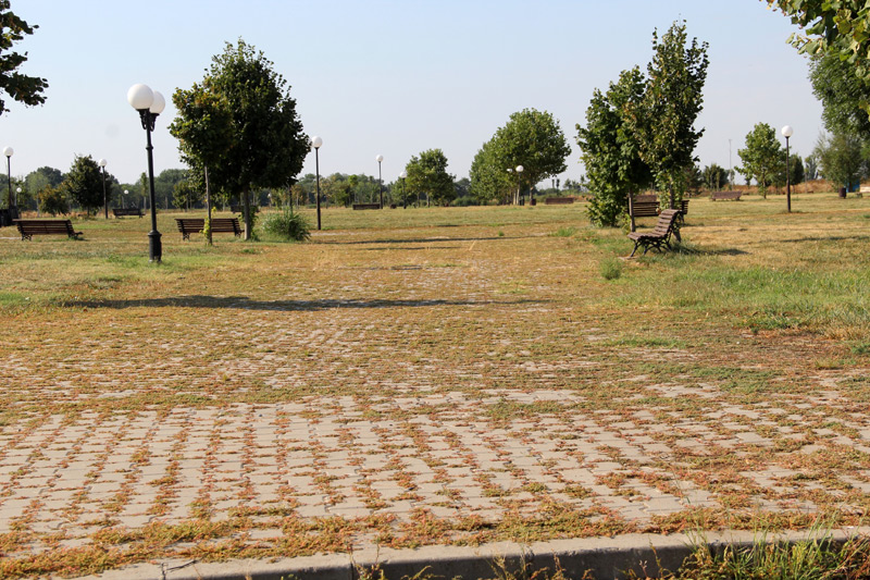 În cei zece ani de existență, un singur lucru bun s-a întâmplat în așa-zisul parc din mijlocul câmpului: copacii plantați înainte de inaugurare s-au făcut destul de mari și oferă ceva umbră în zilele toride de vară. Umbră de care nu prea profită, însă, nimeni. În rest, buruienile au răsărit, pur și simplu, printre pavele, ca și cum aleile ar fi așezate direct pe pământ, nu pe o fundație de nisip și pietriș, așa cum ar fi fost normal. Interesant este faptul că iarba de pe spațiul verde dintre alei a fost recent cosită, însă aleile sunt acoperite în continuare cu acel strat impenetrabil de buruieni. La felul cum stau lucrurile, pare să fie vorba despre o lucrare de mântuială a constructorului, care nu a făcut o fundație corespunzătoare. Firma care a lucrat la realizarea acestui parc se numește "Garden Center Group" SRL și este din București.