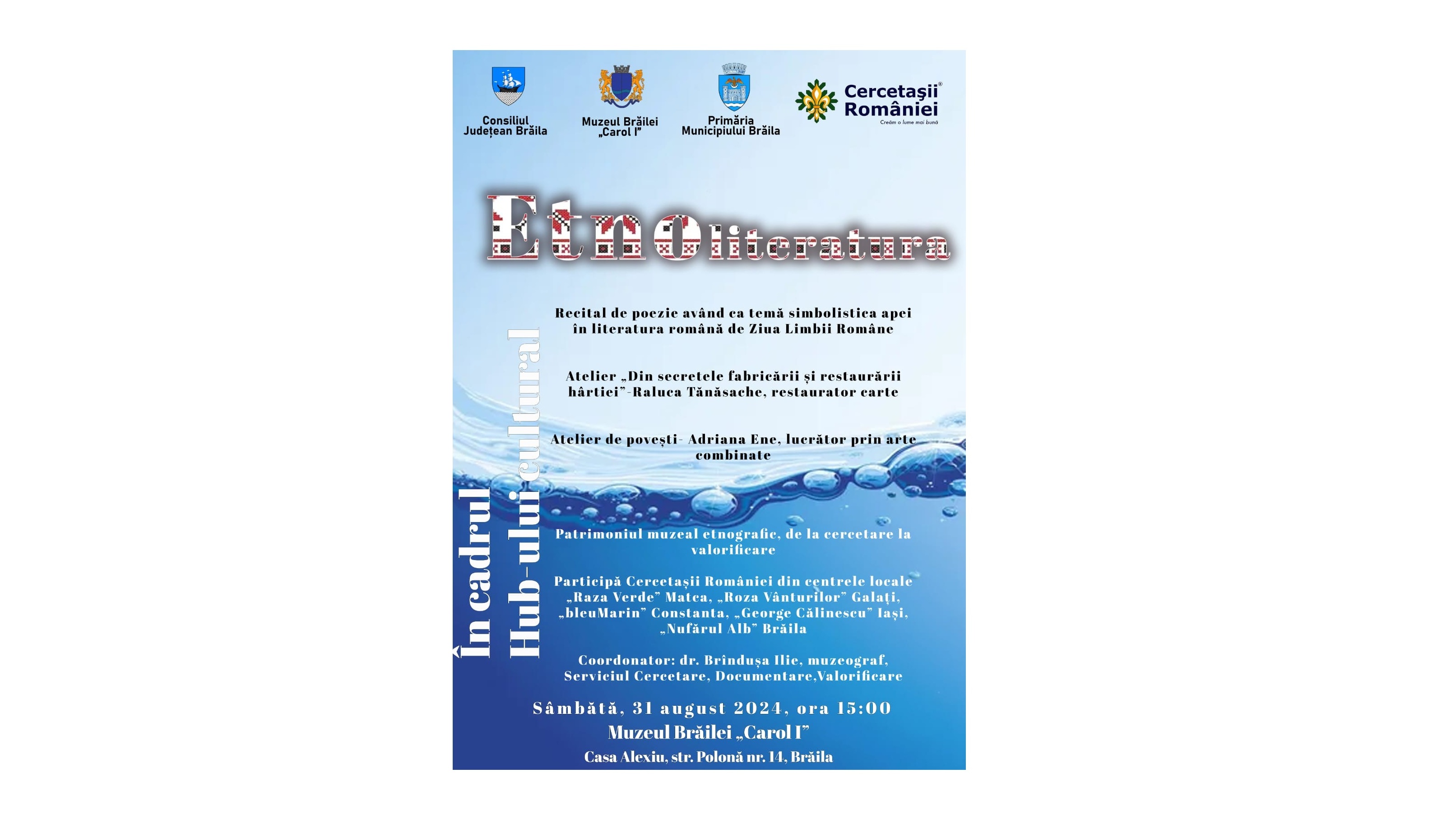 Potrivit muzeografului dr. Brândușa Ilie, din cadrul Serviciului Cercetare, Documentare, Valorificare - coordonatorul evenimentului cultural -, în ziua de sâmbătă, 31 august, de la ora 15.00, brăilenii de toate vârstele sunt invitați în localul somptuoasei Case Alexiu, pentru a lua parte la o nouă activitate din cadrul Hub-ului cultural „Etnoliteratura”.