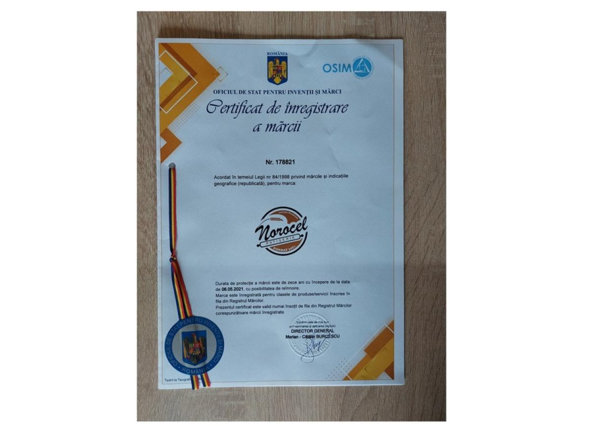 Soții Livia și Iulian-Norocel Ilie au înregistrat marca NOROCEL la Oficiul de Stat pentru Invenții și Mărci (OSIM) încă de la înființarea patiseriei.