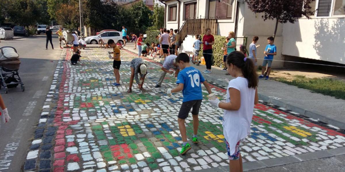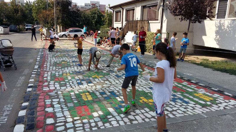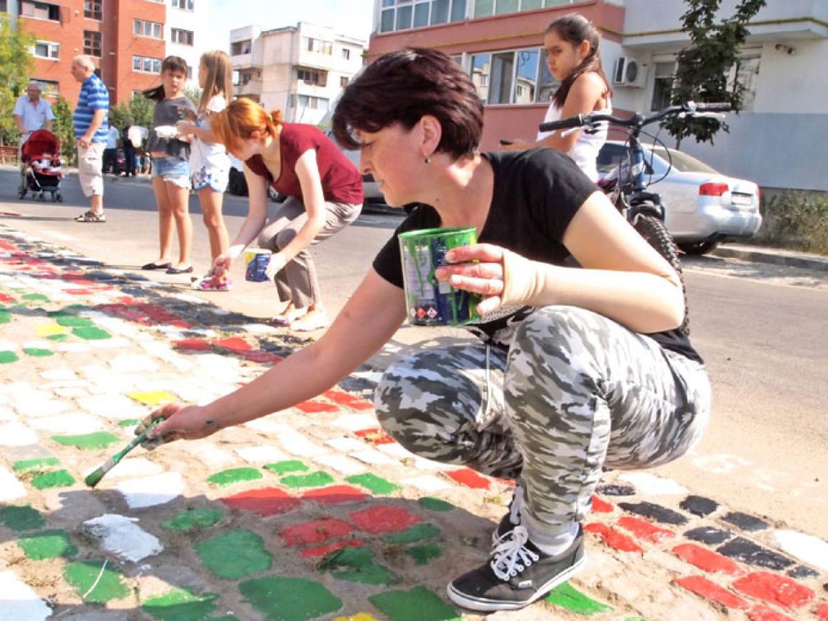 • din proprie iniţiativă, locatarii au dat un plus de culoare zonei • primarul Dragomir le-a acceptat proiectul şi chiar le-a dat o mână de ajutor, participând efectiv la vopsirea pavajului • la final, edilul şef a declarat că o astfel de iniţiativă merită recompensată, astfel că Primăria va moderniza parcul de joacă de lângă blocurile respective