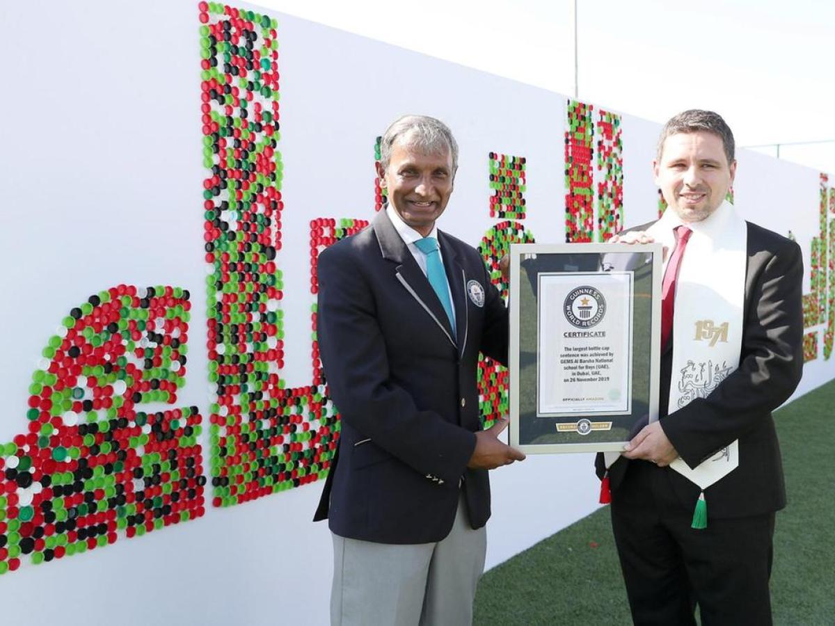 Școala Națională de Băieți Gems Al Barsha, din Dubai, a reușit să obțină un nou record mondial folosind doar patru cuvinte. În urma unei actuvități ce avea să îi învețe pe cei mici să recicleze capacele de sticlă s-au folosit un total de 13.434 de capace pe care le-au utilizat pentru a forma fraza „Ambițiile lui Zayed îmbrățișează spațiul” în limba arabă, iar cei de la Guinness World Records le-au răsplătit pe măsură efortul, anunță TheNational.ae.