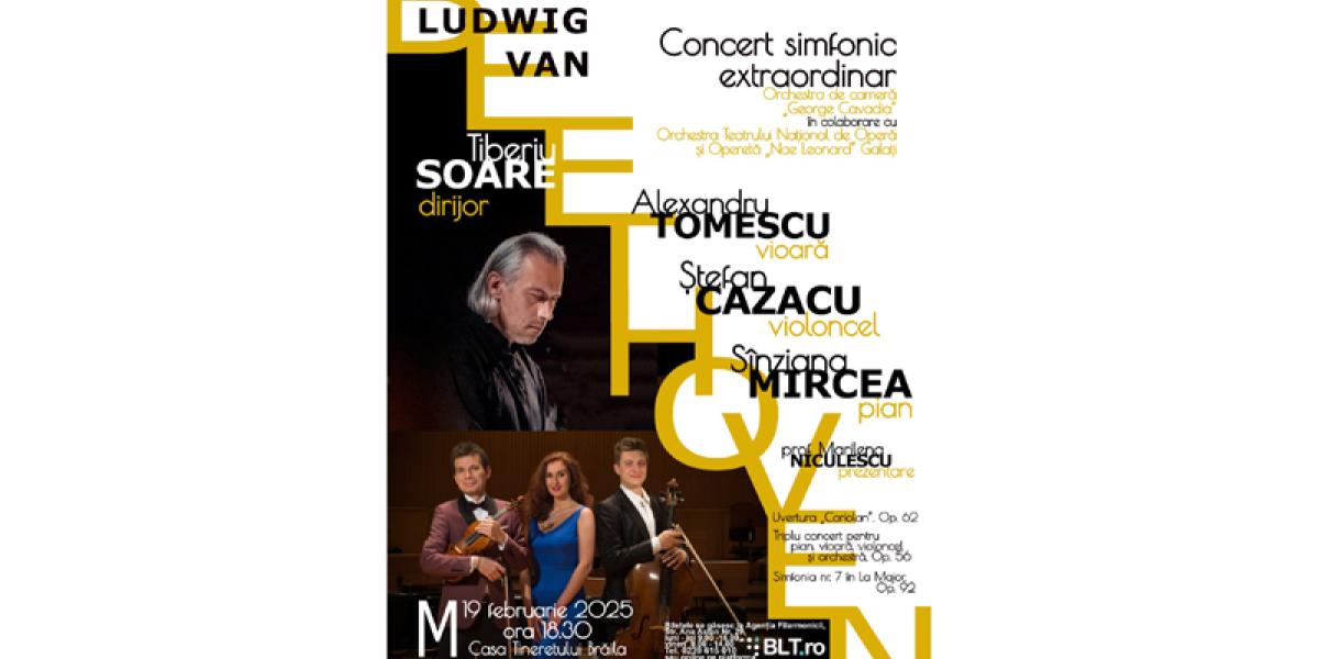 „Între introspecție și spectaculozitate, în această largă paletă de trăiri și emoții veți rămâne captivi, de bunăvoie, în seara lui 19 februarie 2025, la Casa Tineretului, pentru Concertul simfonic extraordinar ce reunește pe aceeași scenă patru muzicieni de renume mondial. Bogăția sonoră, rafinamentul și tehnica impecabilă a interpretărilor vibrante, pline de culoare, ce vă vor fi oferite de cei trei soliști, violonistul Alexandru Tomescu, violoncelistul Ștefan Cazacu și pianista Sînziana Mircea se vor alătura, într-o perfectă simbioză, energiei și expresivității Orchestrei de cameră „George Cavadia” Brăila, în colaborare cu Orchestra Teatrului Național de Operă și Operetă „Nae Leonard” Galați. Profund și riguros, cu o înțelegere detaliată a partiturii și o viziune dirijorală bine conturată, maestrul Tiberiu Soare va fi liantul între orchestră și soliști, între repertoriu și public, pentru că, așa cum chiar dumnealui afirma, „atunci când artistul dă o gaură în Rai, publicul poate să se uite și el prin gaura asta”. Fiți pregătiți pentru raționalul și sublimul beethovenian, întregul program purtându-i semnătura”, a precizat prof. Alexandra Gurgu, secretar muzical al Filarmonicii „Lyra - George Cavadia” Brăila.