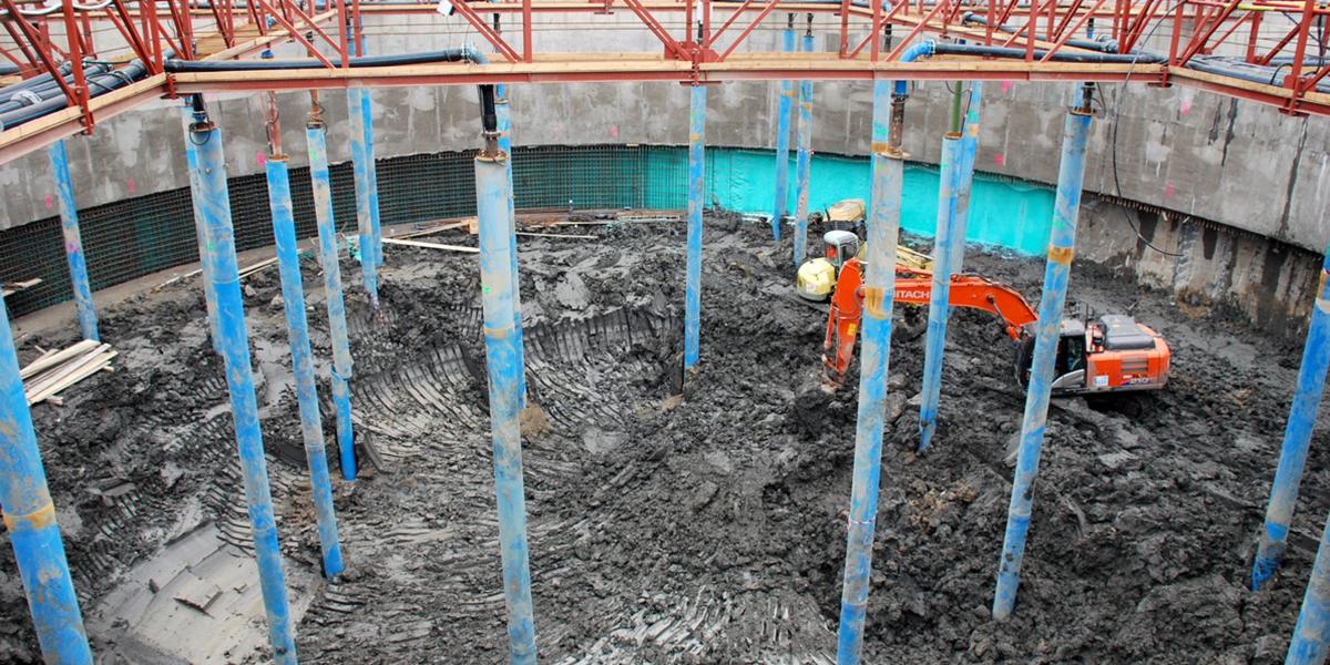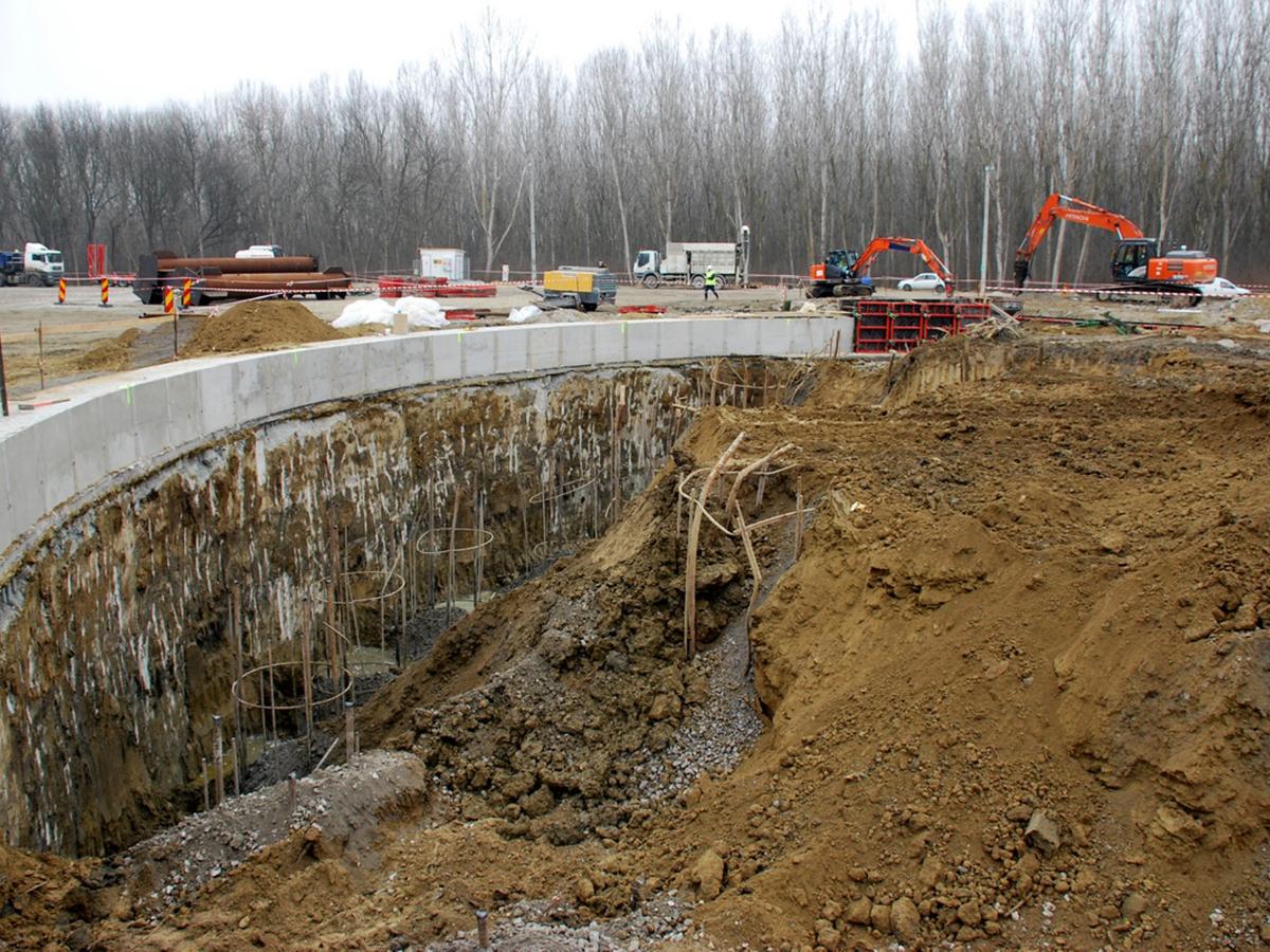 Revenind la ceea ce se face pe malul brăilean, lucrările se desfăşoară, deocamdată doar sub pământ, fiind practic vorba despre fundaţia pilonului, respectiv despre camerele tehnice ale blocului de ancoraj, cele în care vor fi descărcate cablurile de susţinere ale podului. Din cauza sarcinilor imense aduse de cablurile care vor prelua toată greutatea întregii structuri, blocul de ancoraj va trebui să aibă o formidabilă rezistenţă. Tocmai de aceea vorbim despre o incintă cu pereţi groşi de beton ce va ajunge în adâncime până la o cotă de minus 22 de metri de la nivelul mării. O serie de senzori montaţi în diferite etape ale construcţiei vor arăta dacă structura e stabilă în timp, urmărindu-se gradul de înclinaţie, tasările şi alţi parametri. În prezent s-a ajuns la cota minus 5 metri cu betonarea pereţilor perimetrali, iar excavările continuă, turnarea betonului făcându-se în casete de câte 3 metri, pe măsură ce săpăturile avansează. Incinta în care se fac săpături se depresurizează, apa din pânza freatică fiind evacuată cu ajutorul unor pompe de mare putere. Circa 600 de litri pe secundă se pompează continuu, apa respectivă fiind dirijată, prin intermediul unor ţevi, până dincolo de dig, de acolo fiind preluată de un canal şi deversată în fluviu. Reprezentantul firmei “Astaldi” ne-a spus că, dacă acest ritm de lucru va fi menţinut şi nu vor interveni probleme neprevăzute, blocul de ancoraj va fi închis cam în luna iulie a anului viitor.