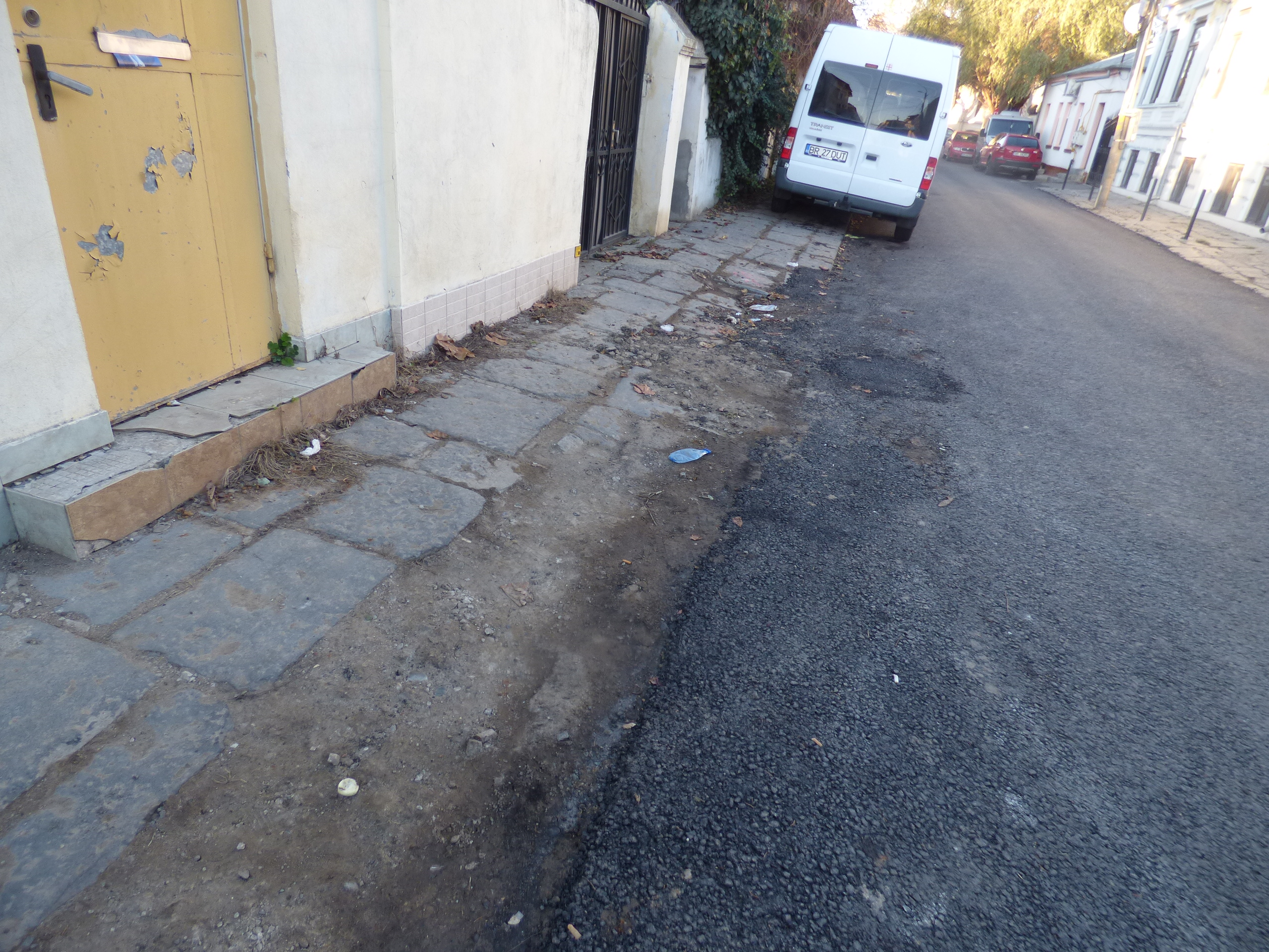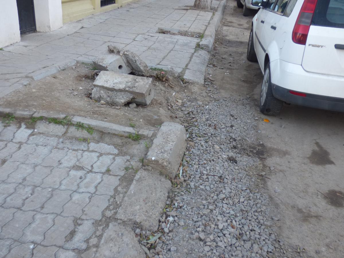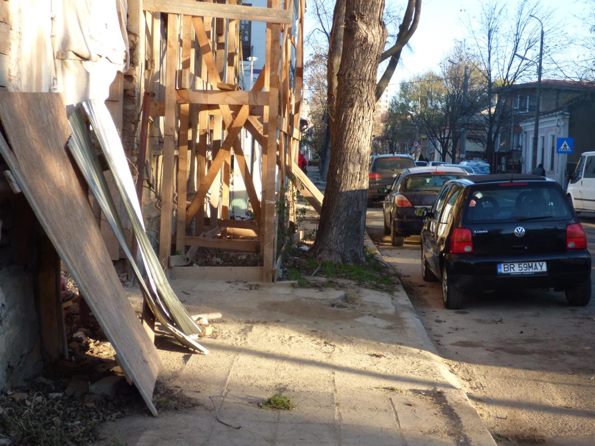 Alte nereguli şi pe Str. Polonă: un şanţ de la o reţea de utilităţi neasfaltat, borduri şi casete din beton dislocate, deşeuri inerte, gunoi şi o schelă pentru un imobil în reabilitare care ocupă toată lăţimea trotuarului.