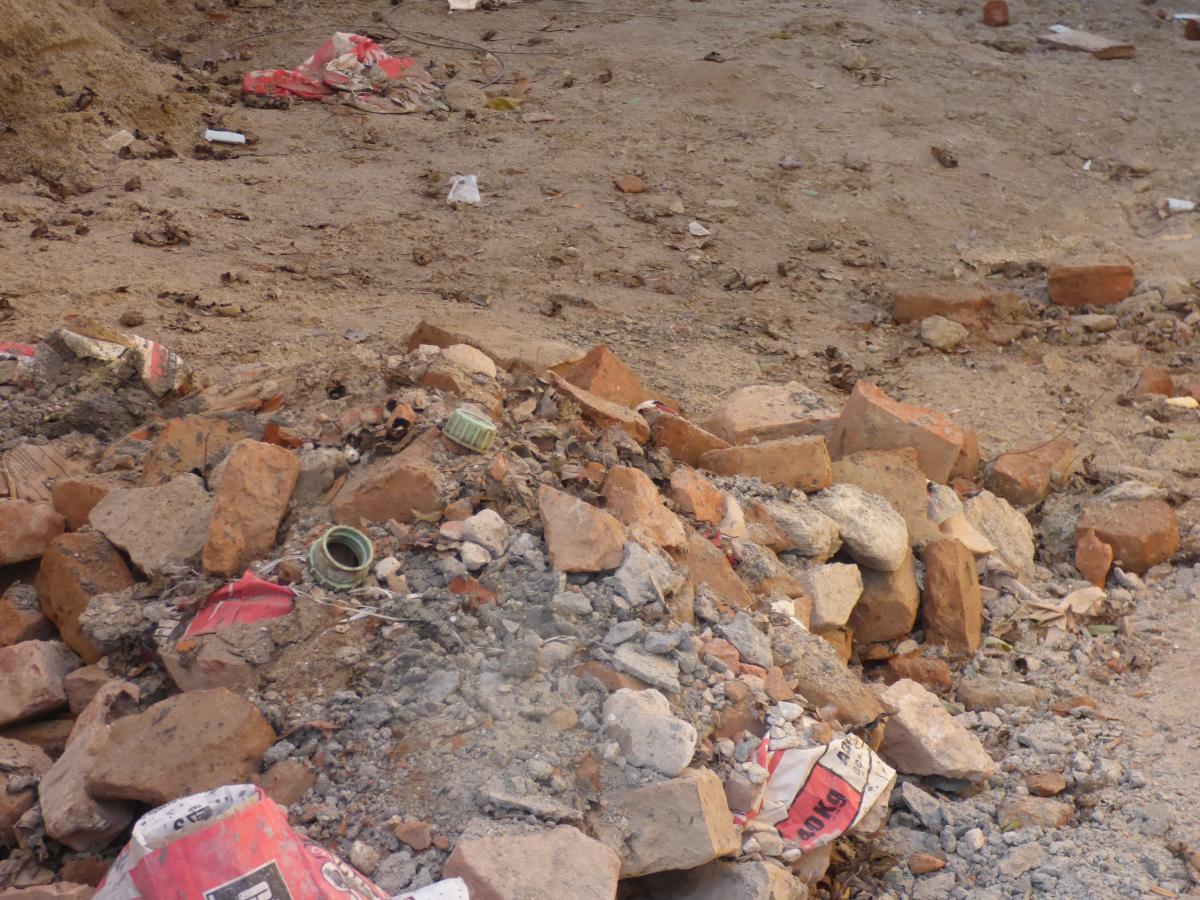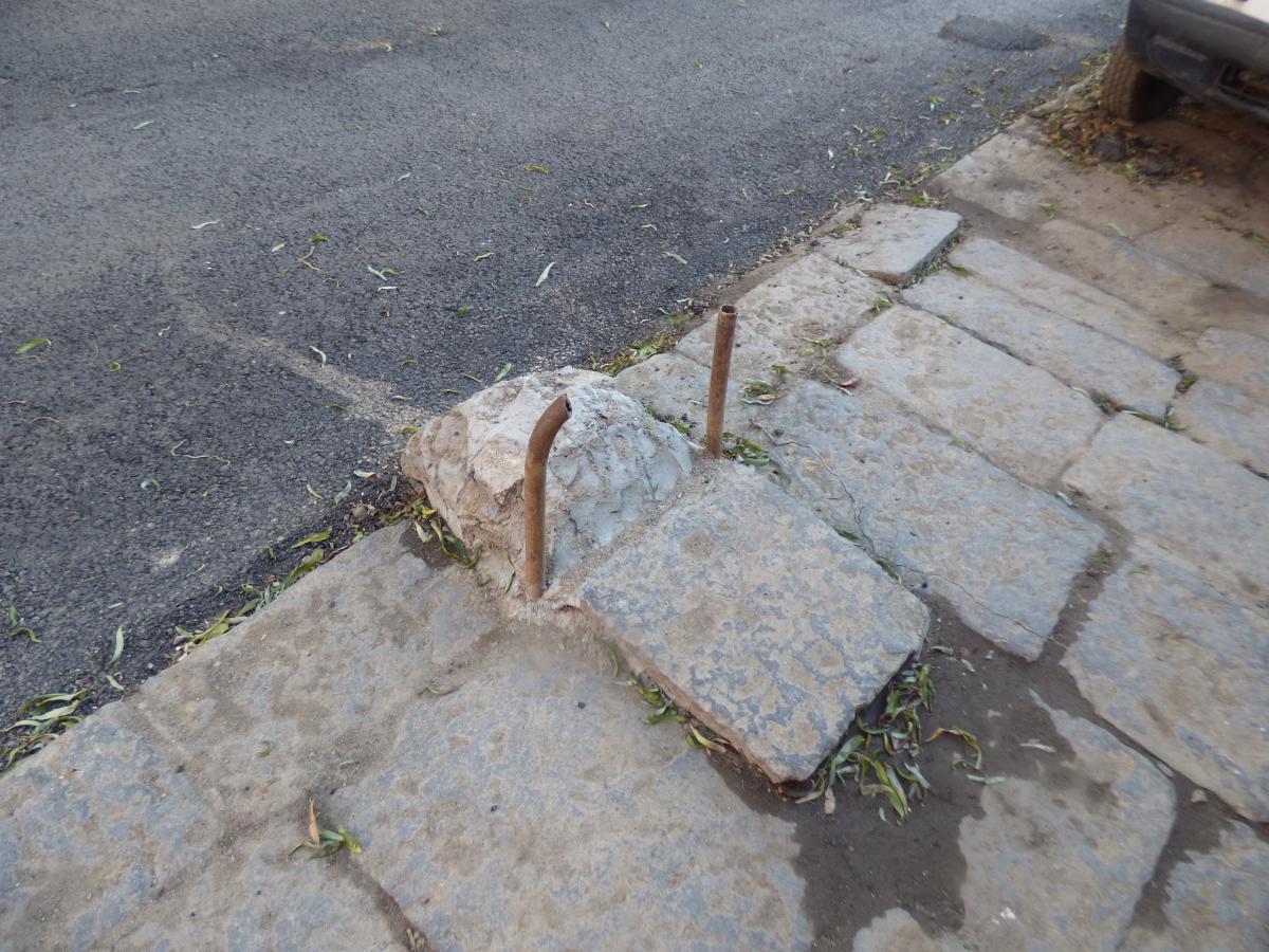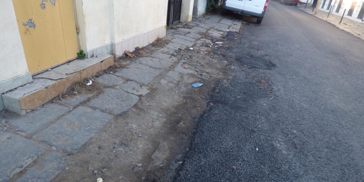 Alte nereguli şi pe Str. Polonă: un şanţ de la o reţea de utilităţi neasfaltat, borduri şi casete din beton dislocate, deşeuri inerte, gunoi şi o schelă pentru un imobil în reabilitare care ocupă toată lăţimea trotuarului.