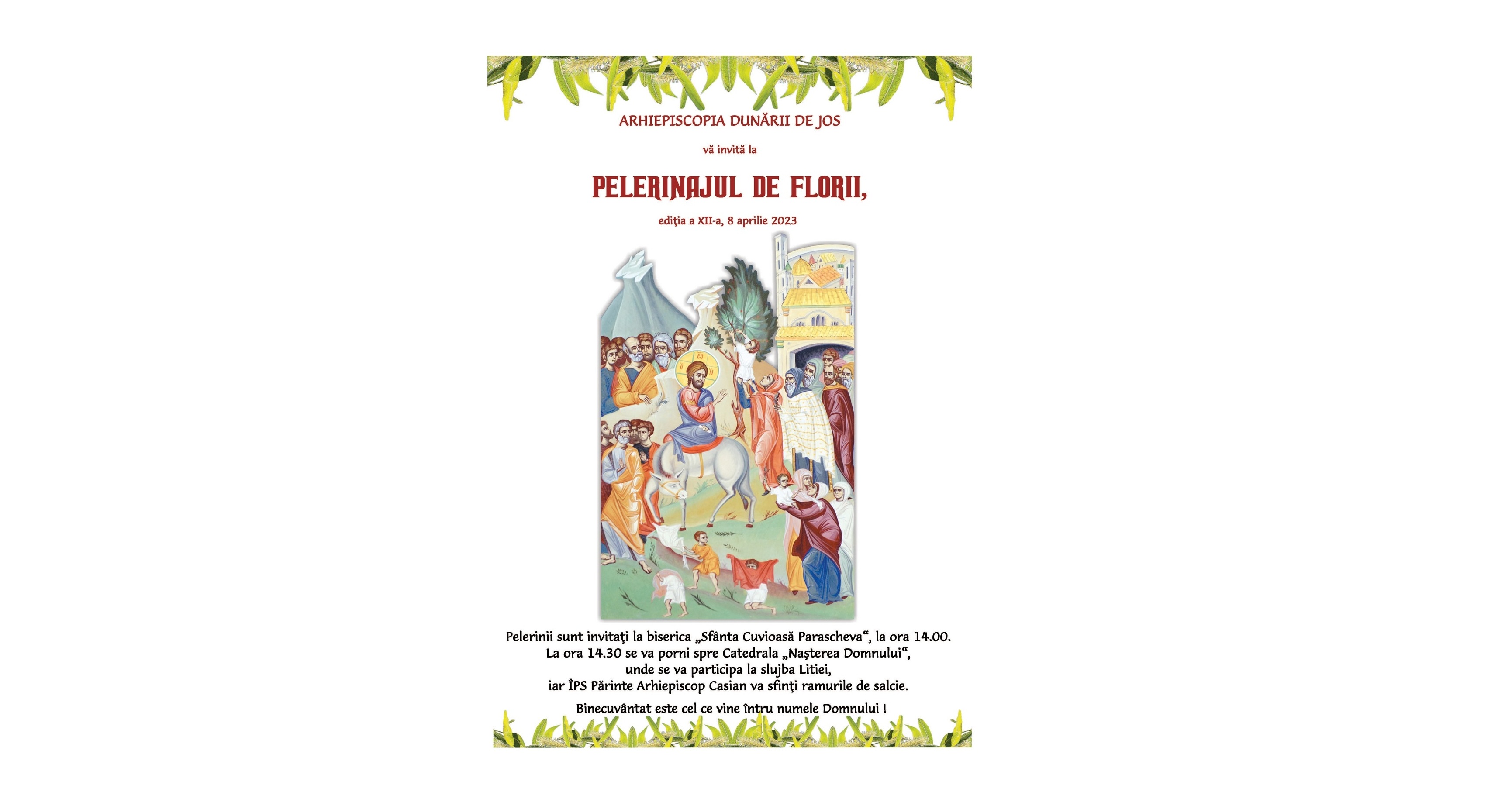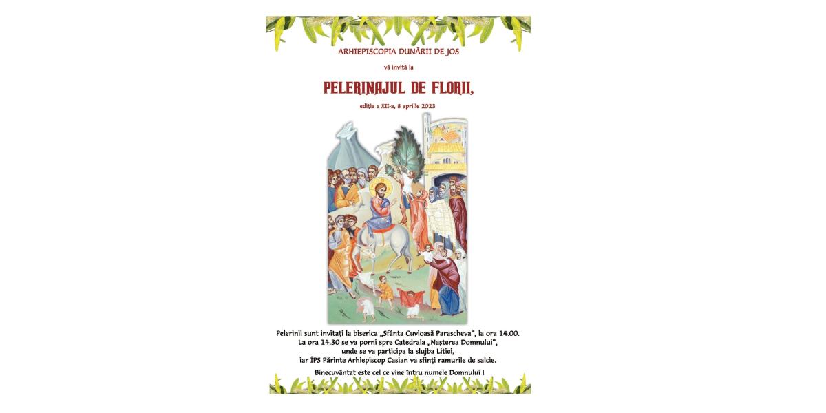 Potrivit unui comunicat al Biroului de Presă al Arhiepiscopiei Dunării de Jos, în ziua de sâmbătă, 8 aprilie 2023, în ajunul Praznicului împărătesc al Floriilor, în cele două municipii ale Eparhiei - Brăila și Galați - precum și în alte localități din cele două județe se va desfășura tradiționalul Pelerinaj de Florii, care amintește de momentul Intrării Mântuitorului nostru Iisus Hristos în cetatea Ierusalimului.