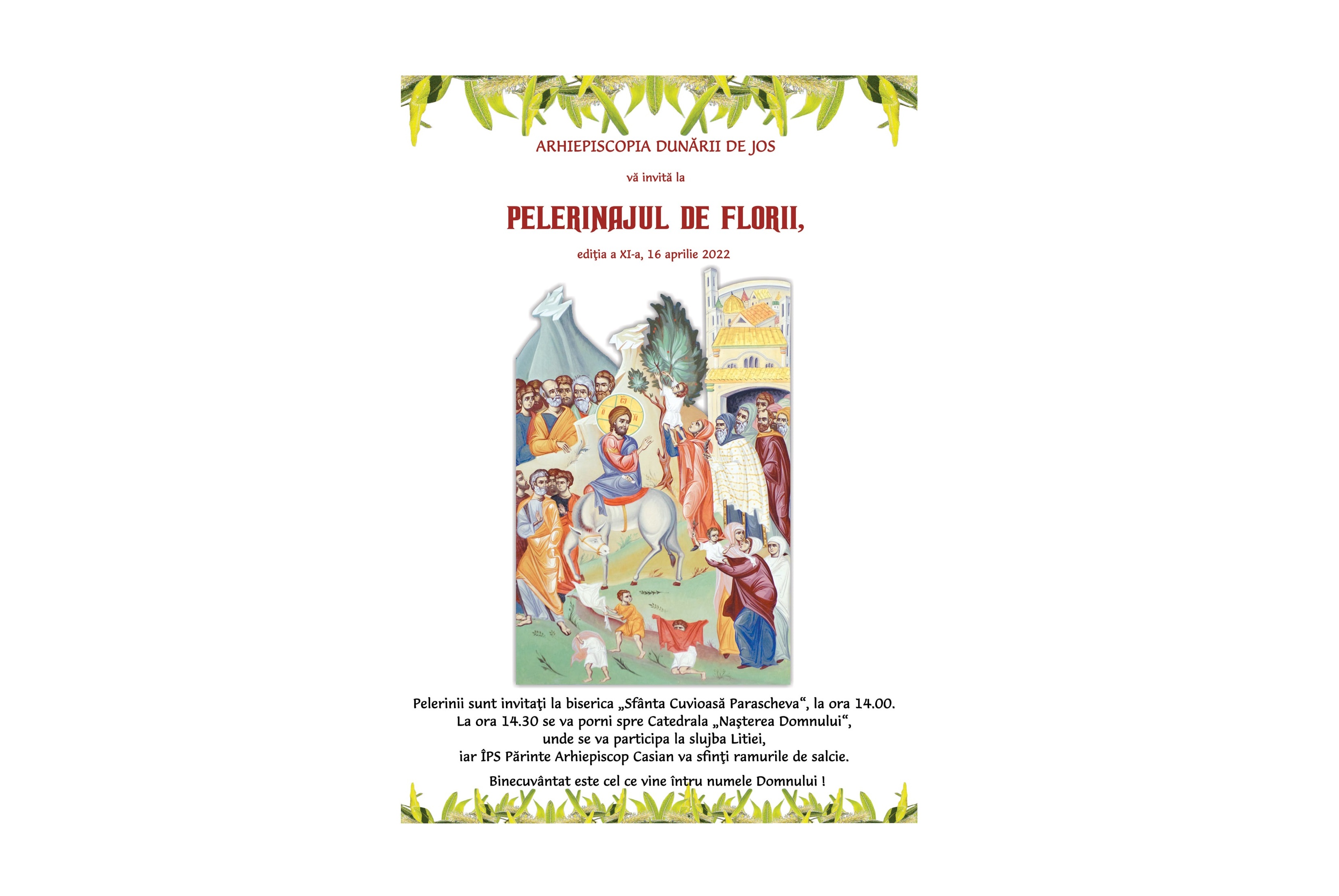 În Duminica Floriilor (17 aprilie), Înaltpreasfinţitul Părinte Casian va săvârşi Sfânta Liturghie la Catedrala Arhiepiscopală din Galaţi. Totodată, se vor oficia slujbe speciale în toate bisericile Eparhiei Dunării de Jos. Pentru cei care au ţinut post, e bine de ştiut că în Duminica Floriilor este dezlegare la peşte.