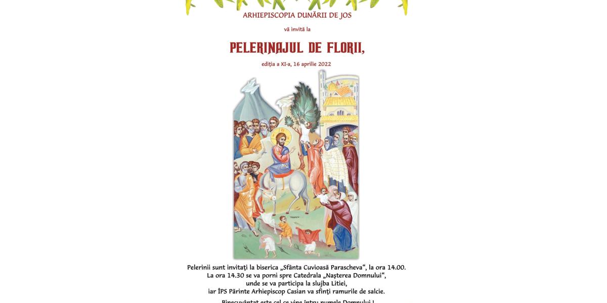 Sâmbătă, 16 aprilie 2022, în ajunul Praznicului Împărătesc al Floriilor, în municipiile Brăila şi Galaţi, precum şi în alte localităţi din cele două judeţe ale Arhiepiscopiei Dunării de Jos, se va desfăşura tradiţionalul Pelerinaj de Florii, care aminteşte de momentul Intrării Mântuitorului nostru Iisus Hristos în cetatea Ierusalimului, informează Biroul de Presă al Arhiepiscopiei Dunării de Jos.