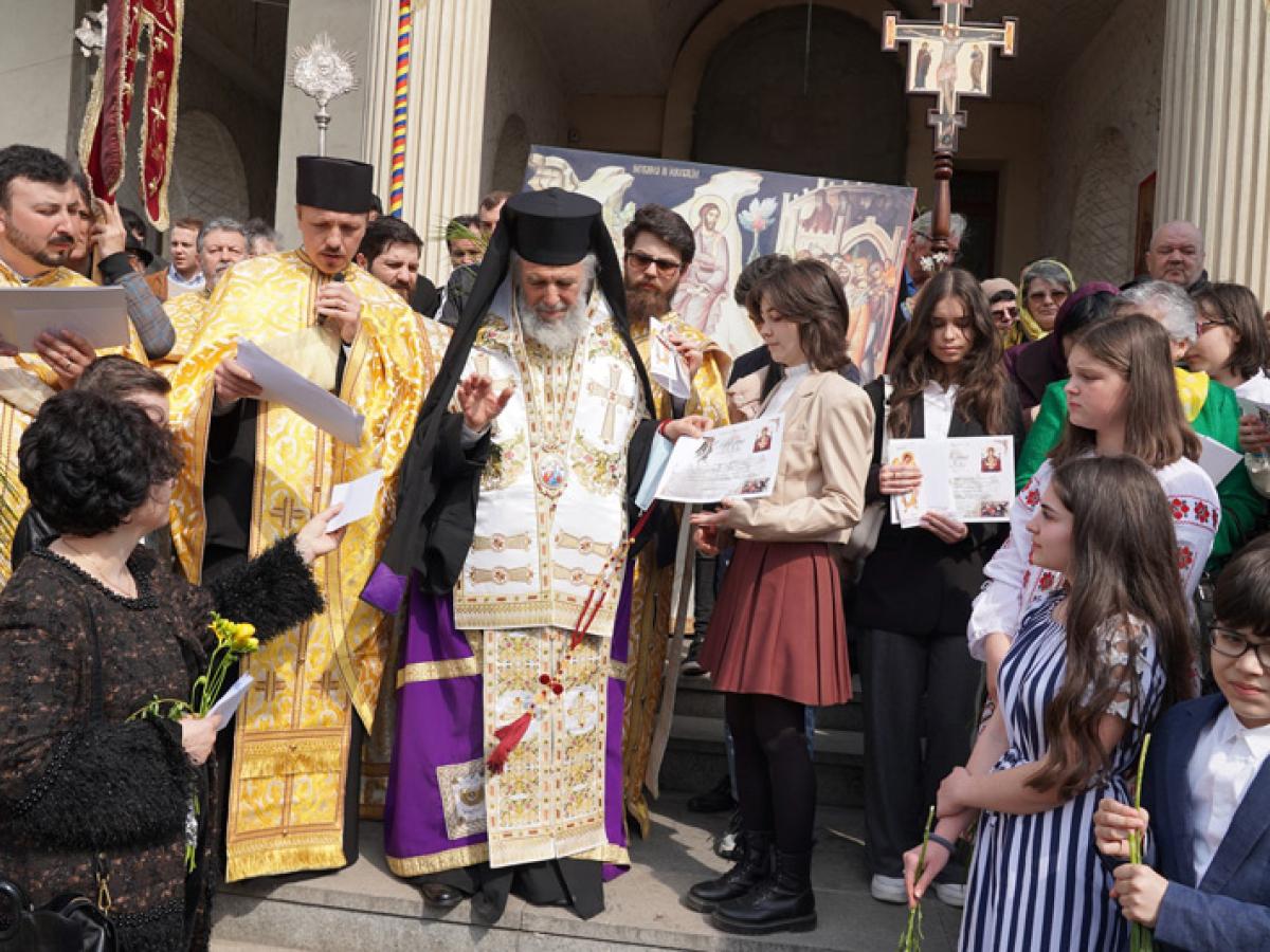 * sute de preoți, copii și credincioși au participat, sâmbătă, la Procesiunea de Florii, parcurgând drumul de la "Sf. Parascheva" la Catedrală, cu icoane în mâini * prezent la Brăila, ierarhul Dunării de Jos le-a oferit premii elevilor conștiincioși și i-a binecuvântat pe brăileni