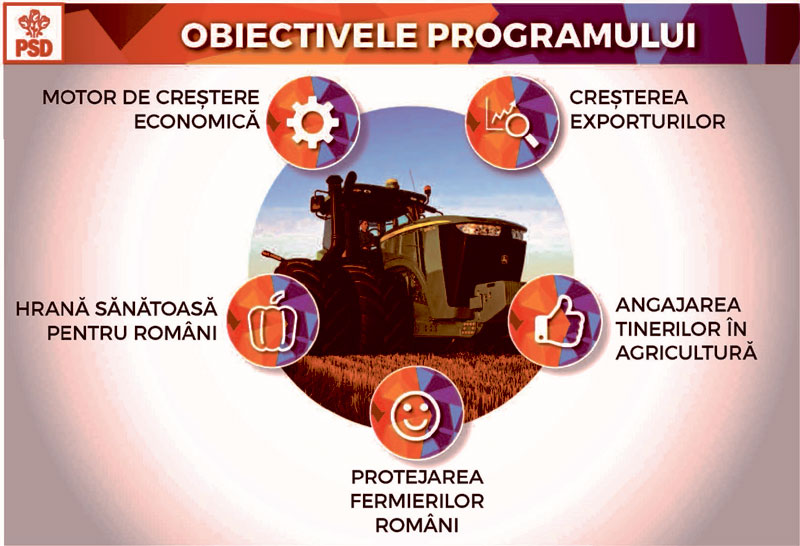 Prin măsurile propuse în programul de guvernare PSD va acţiona pentru crearea condiţiilor financiare fiscale care să permită modernizarea agriculturii, recâştigarea pieţei interne, reducerea importurilor şi creşterea exporturilor asigurându-se o hrană sănătoasă întregii populaţii şi siguranţa şi securitatea alimentară în România.
