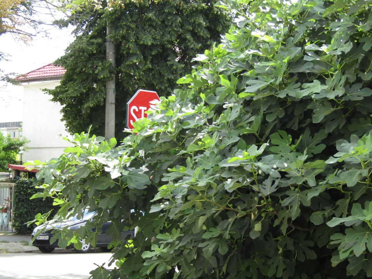 Lucrurile, însă, nu se opresc aici. Fiindcă, total nemulțumit, brăileanul L.A. ne-a supus atenției (cu “bătaie” spre autoritățile locale) un alt aspect: obturarea totală a multor indicatoare de circulație din cauza copacilor și arbuștilor netoaletați. De exemplu, în intersecția Școlilor/Mihai Bravu indicatorul STOP este complet acoperit de un smochin crescut sălbatic, care a ocupat tot trotuarul. Practic, indicatorul îl poți vedea doar după ce ai trecut de el. Al doilea caz este în intersecția bulevardului Panait Istrati cu Str. Cetății, unde circulația nu este atât de intensă, dar condițiile unui accident există.