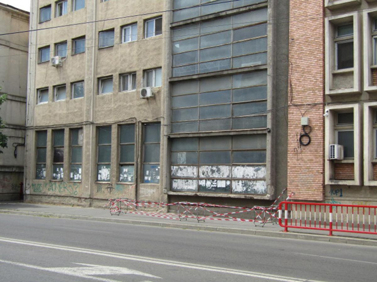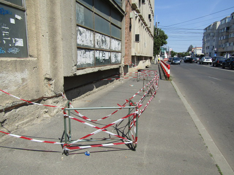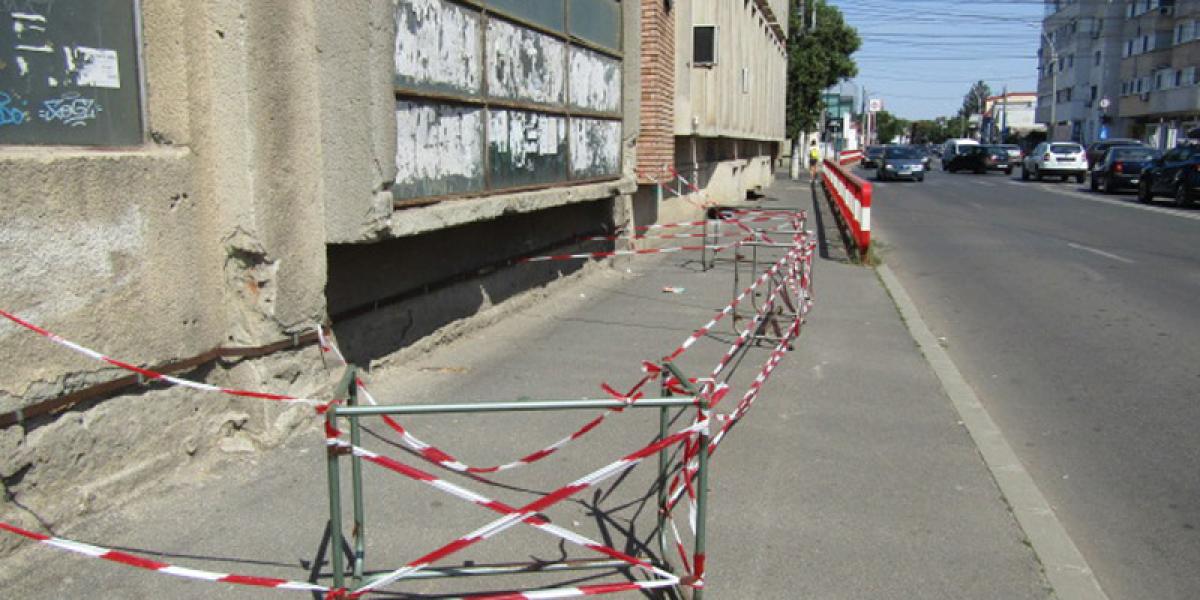 * de circa două luni, pe trotuarul de pe strada Griviței au fost montate mijloace de semnalizare, pentru ca pietonii să ocolească zona unde ar putea să cadă o bucată de tablă de pe fațadă * toată lumea se întreabă cât va mai dura această soluție * într-un final, autoritățile locale au somat, pe 29 iulie, firma Braiconf să securizeze zona, în termen de o lună * în caz contrar, se poate aplica o amendă de până la 2.500 lei