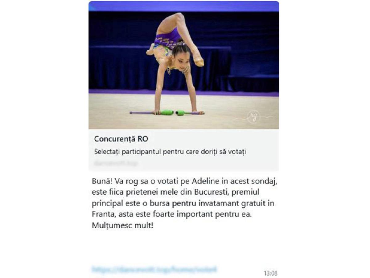 • sub pretextul simplu al «exprimării unui vot online în cadrul unui concurs», autorii încearcă să atragă utilizatorii într-o schemă de înșelăciune în mediul online • mai nou, utilizatorii primesc mesaje nesolicitate, formulate în limba română, care îi îndeamnă să acceseze un link pentru a acorda ajutor unei oarecare Adeline, care participă la un concurs de dans și este prezentată ca fiică a unei prietene • nu picați în plasa escrocilor, ci verificați informațiile