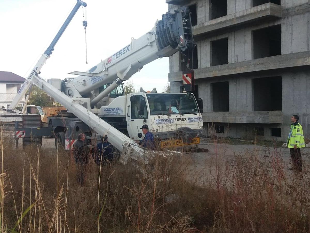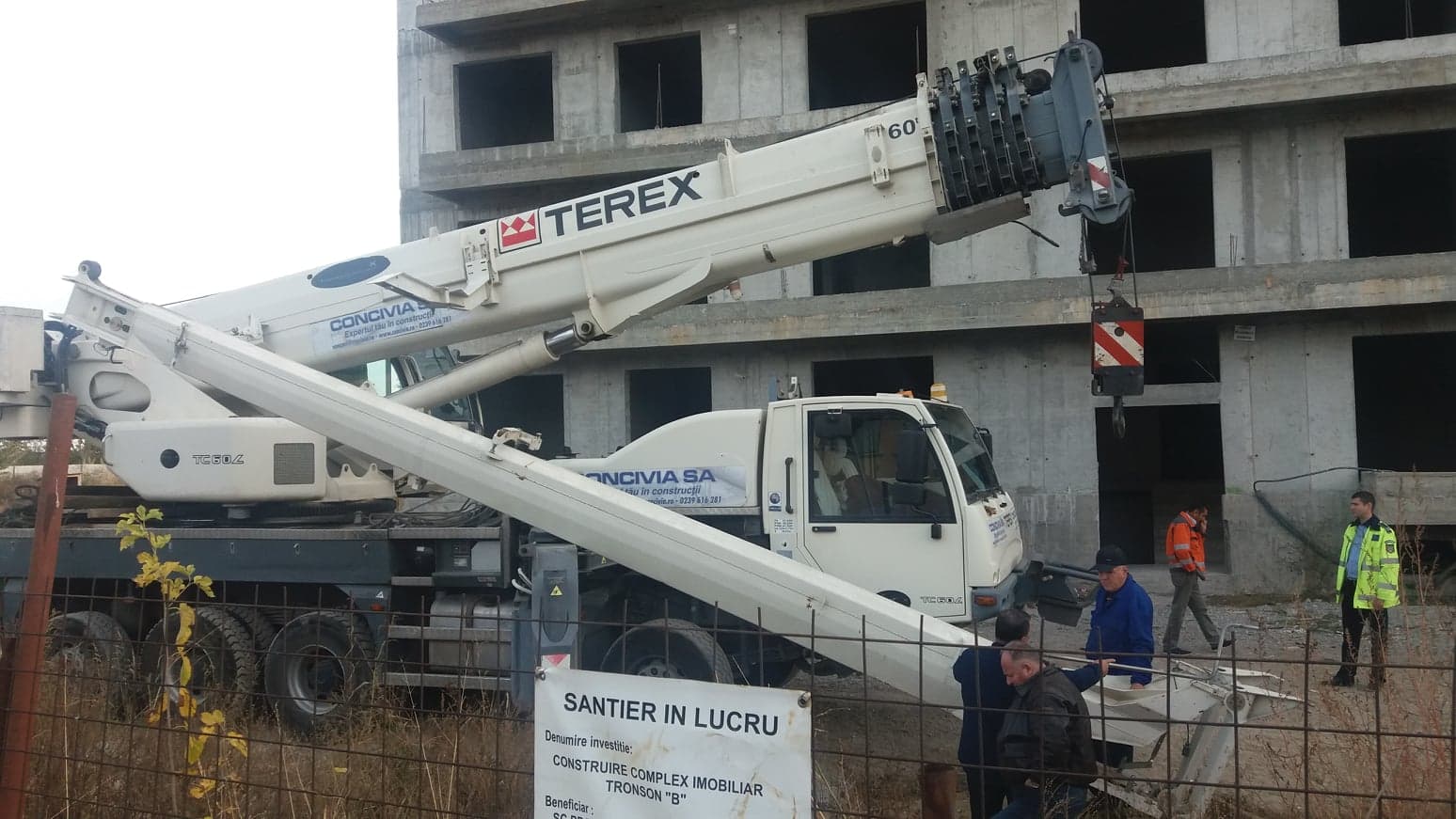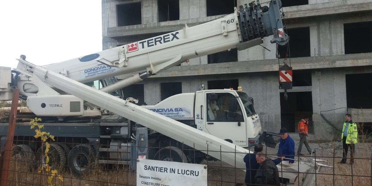 UPDATE: Bărbatul prins sub macara este din localitatea Șuțești, are 24 de ani și, se pare, este angajatul firmei „Concivia”, societate care construiește un bloc în cartierul Minerva, pe strada Panciu.