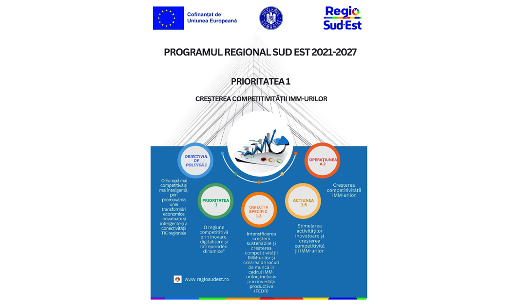 Agenția pentru Dezvoltare Regională Sud-Est, în calitate de Autoritate de Management pentru Programul Regional Sud-Est 2021-2027, anunță lansarea apelului de proiecte dedicat IMM-urilor în cadrul Priorității 1 “O regiune competititivă prin inovare, digitalizare și întreprinderi dinamice”, Acțiunea 1.6 ”Stimularea activităților inovatoare și creșterea competitivității IMM-urilor”. Această acțiune vizează creșterea competitivității IMM-urilor și crearea de locuri de muncă în cadrul acestora prin inovare, digitalizare și dezvoltarea de întreprinderi dinamice, în vederea unei îmbunătățiri semnificative a capacității tehnologice, industriale și organizaționale de a gestiona dezvoltarea de produse și servicii.