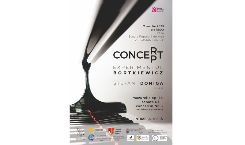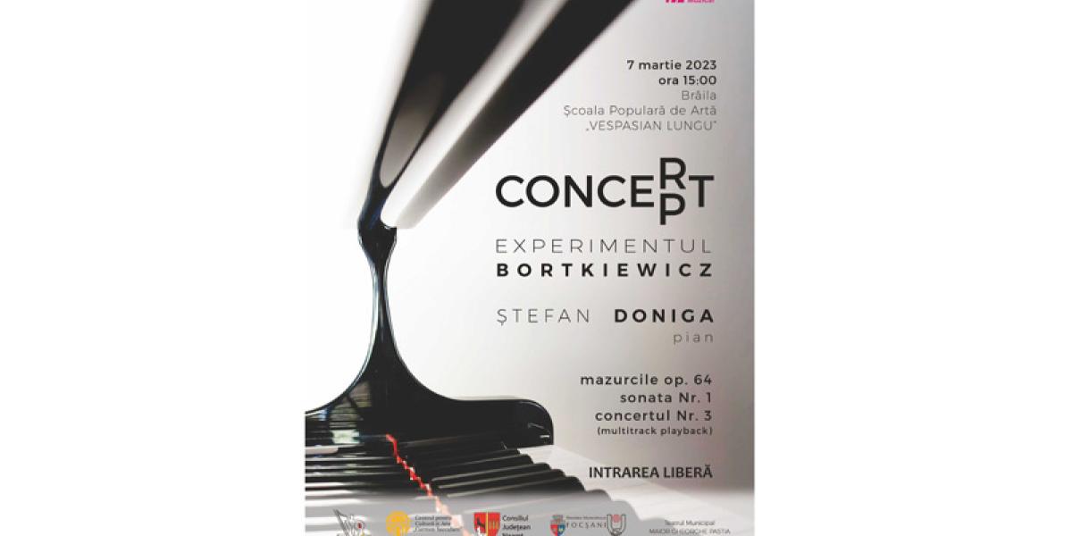 Astfel, în ziua de marți, 7 martie a.c., de la ora 15.00, în sala de spectacole a Școlii Populare de Arte și Meserii „Vespasian Lungu” Brăila are loc recitalul-concert susținut de reputatul pianist român Ștefan Doniga, intitulat „Experimentul Bortkiewicz”. Potrivit managerului instituției gazdă, dr. Cristian Morozan, prin acest demers, Ștefan Doniga include Brăila în turneul național de recitaluri desfășurat sub titlul „Experimentul BORTKIEWICZ”, dezvoltând astfel un concept original prezentat în premieră publicului din România.