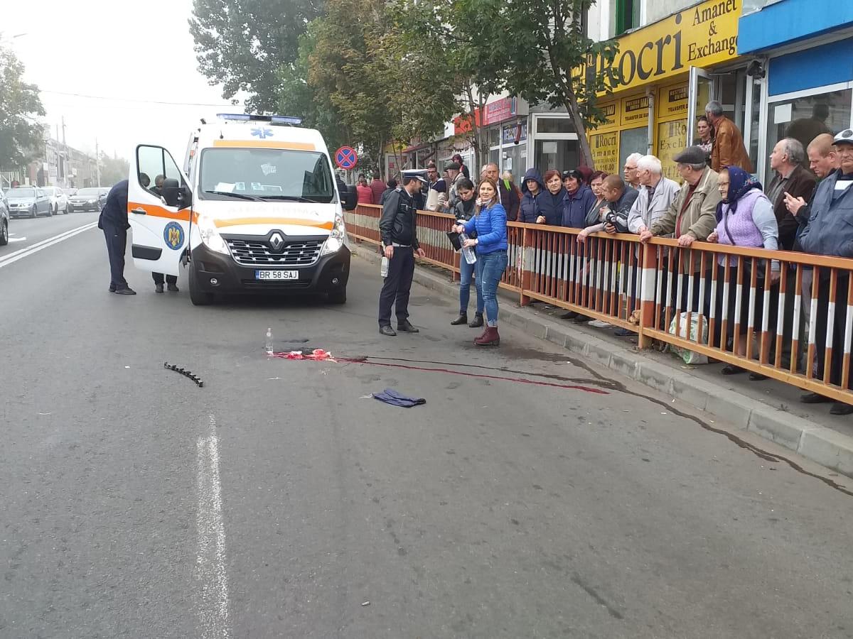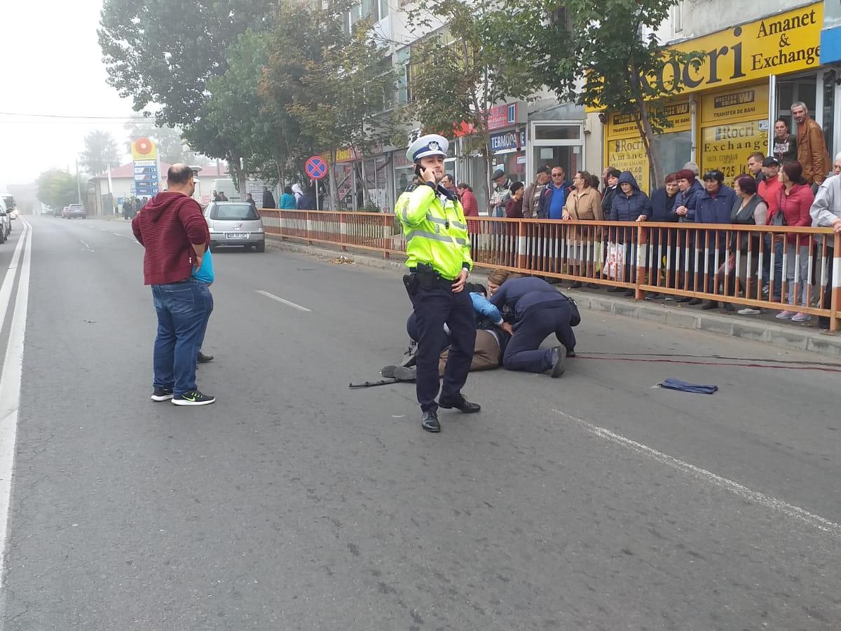 ȘTIRE INIȚIALĂ Pensionar lăsat într-o baltă de sânge după un grav accident produs în zona Piața Mare. Victima traversa pe marcajul pietonal de pe strada Grivița și a fost surprinsă de un autoturism care a virat stânga. În zonă era o pată de sânge, iar medicii de la ambulanța deplasată la fața locului încercau să îl mențină în viață pe cel accientat grav. Imediat după accident, mai multe persoane au sărit să îl ajute pe bărbatul accidentat.