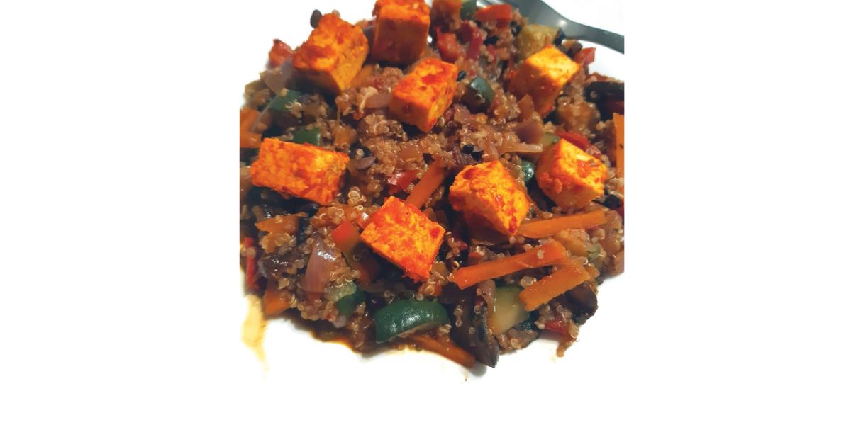 Ingrediente: o ceapă roșie, un morcov, un ardei capia,1/2 dovlecel, 4-5 ciuperci de mărime medie, 3-4 roșii uscate, 50 gr quinoa, 150 gr tofu, 1 lingură de bulion, oregano, un praf de boia de ardei, un praf de turmeric, o lingură ulei de măsline, pătrunjel.