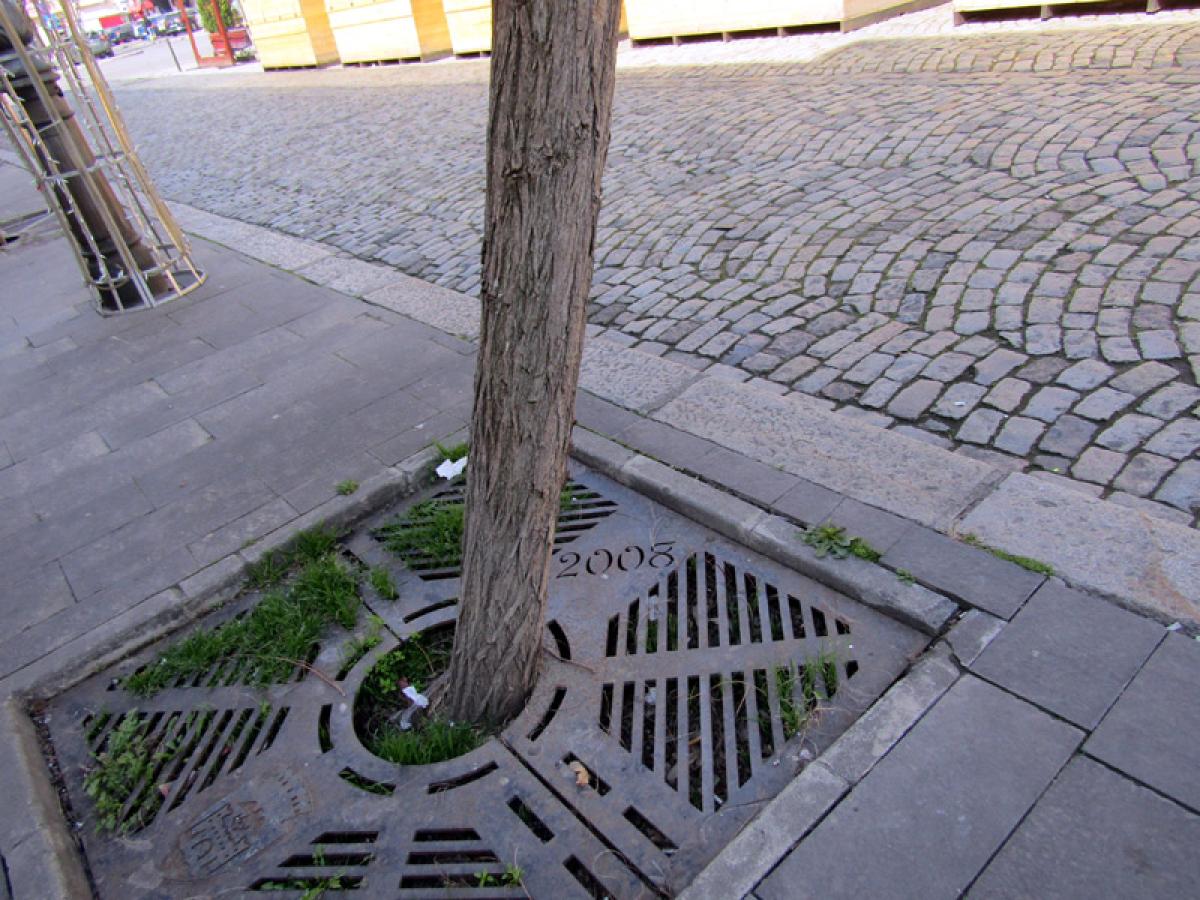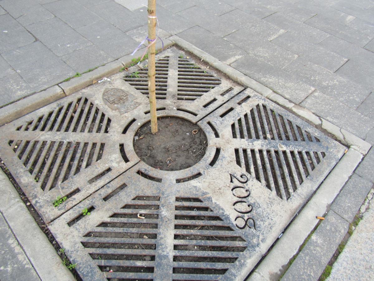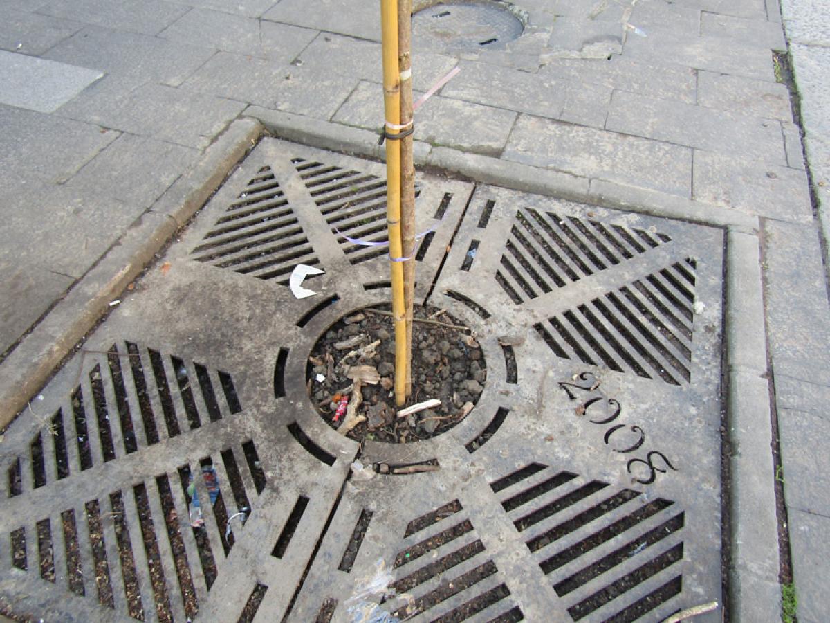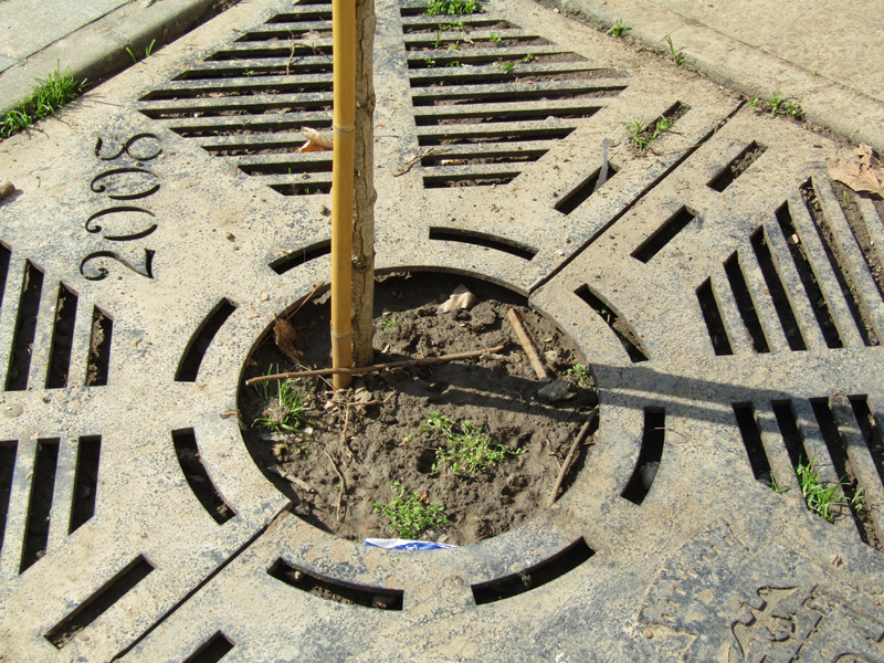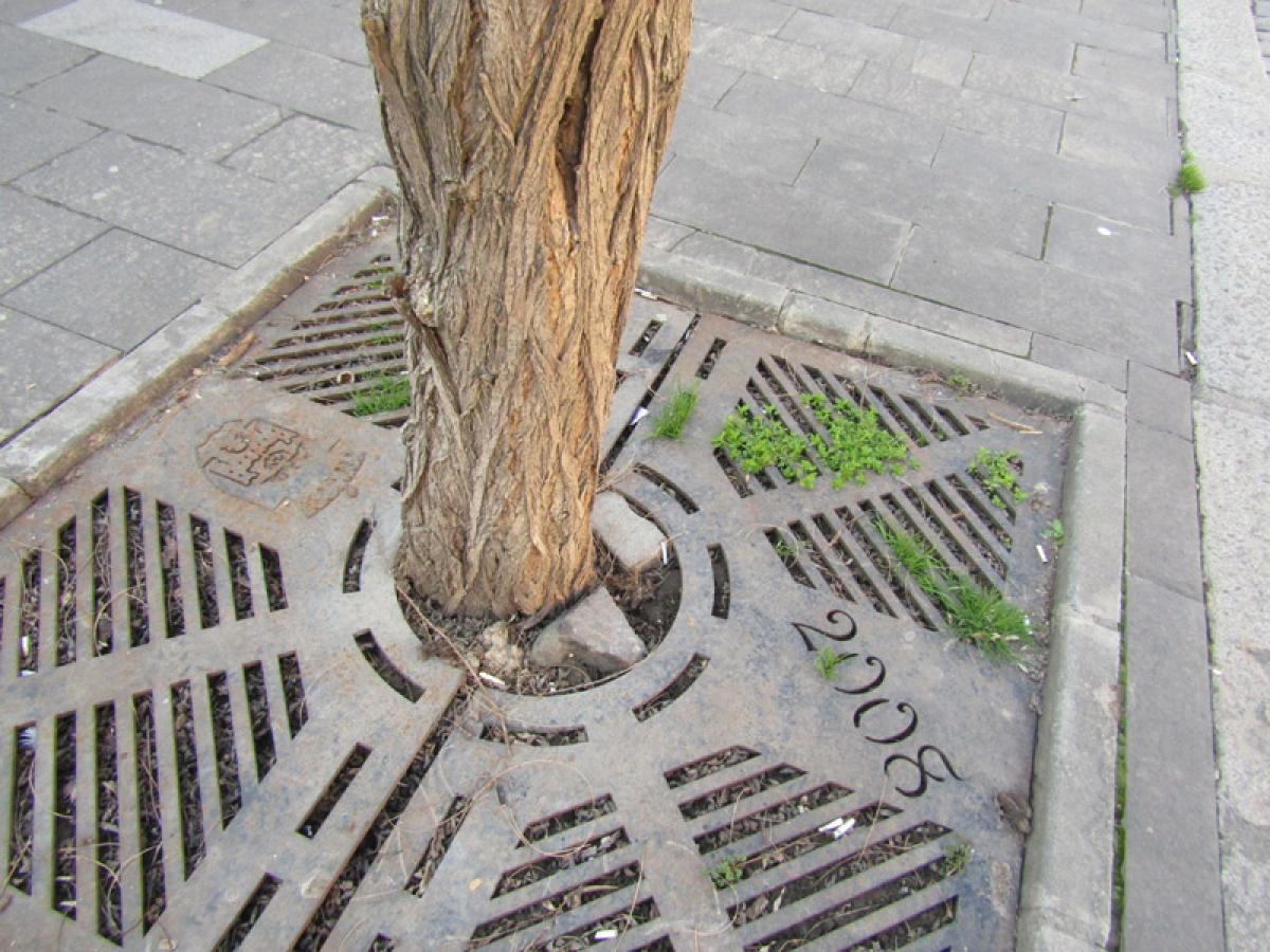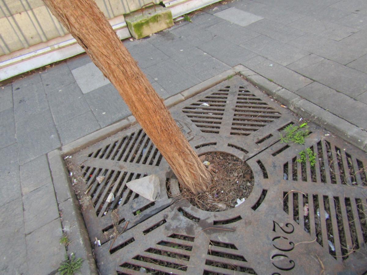 • nu toți puieții de salcâm puși recent în locul celor care au trebuit înlocuiți pentru că s-au uscat au ”nimerit” pe centrul grilajelor metalice de protecție • pe lângă faptul că nu se menține o linie dreaptă care să completeze armonios imaginea de ansamblu a străzii, acești puieți vor fi stânjeniți, în procesul de creștere, de grătarele menite, teoretic, să-i protejeze