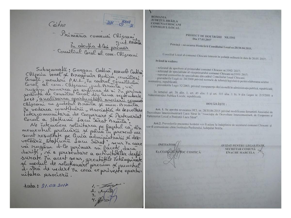 • consilierii liberali ai comunei Chiscani, în frunte cu Costică Gorgan susţin că îşi doresc Asociaţia de Dezvoltare Intercomunitară pentru Staţiunea Lacu Sărat • Gorgan îl acuză pe primarul comunei, PSD-istul Costică Cojea, că s-ar afla în spatele respingerii acestui proiect • consilierul a prezentat o adresă din 2017 prin care membrii PNL îi solicitau lui Cojea să reia discuţiile despre asociere, lucru care nu s-a mai întâmplat