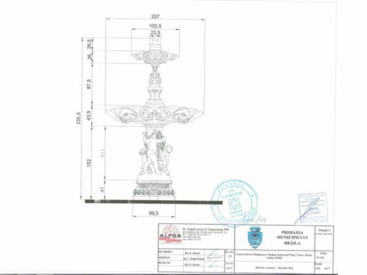 Municipalitatea a scos din nou la bătaie contractul de consolidare şi reabilitare a fântânii din Piaţa Traian, înscrisă în registrul monumentelor istorice, după ce la precedenta tentativă lansată pe finalul anului trecut nici un specialist nu s-a arătat interesat de această lucrare. Valoarea achiziţiei s-a păstrat similară celei din decembrie 2017, adică undeva la 562.000 lei, fără TVA. Este vorba despre un contract în cadrul căruia s-a planificat reconstituirea, printre altele, a expresivităţii arhitecturale şi spaţiale a componentelor acesteia prin consolidarea şi restaurarea elementului sculptural din metal al fântânii (deteriorat); reconstituirea rebordului de piatră şi a cuvei bazinului, inclusiv hidrofobizarea sa; refacerea infrastructurii cuvei bazinului; sistematizarea verticală; realizarea unui sistem de iluminare menit să pună în valoare fântâna; revizuirea şi modernizarea instalaţiei de aducţiune şi evacuare a apei. Valoarea estimată, fără TVA, este de 561.451,71, din care circa 546.599 lei cheltuieli pentru investiţia de bază, restul fiind încadrate, printre altele, la cheltuieli pentru amenajarea de şantier, sau cheltuieli pentru asigurarea utilităţilor necesare obiectivului. Firmelor interesate de acest contract li se solicită constituirea unei garanţii de participare în cuantum de 5.614 lei, reprezentând 1% din valoarea contractului. De asemenea, firmele participante trebuie să prezinte lista principalelor lucrări realizate în cursul unei perioade care acoperă cel mult ultimii 5 ani, din care să reiasă că au fost executate lucrări similare în valoare cumulată de minimum 561.451 lei fără TVA. Contractul va fi atribuit după procedura “cerere de ofertă” - procedura simplificată într-o singură etapă, cu unic criteriu de selecţie - “preţul cel mai scăzut”. De precizat că proiectantul a propus două variante de lucru menite să restaureze piesele din fontă sparte ori crăpate în urma vandalizării monumentului istoric: scanarea 3D a soclului fântânii similare din Sinaia, judeţul Prahova, sau realizarea unui mulaj astfel încât să se poată realiza pe baza acestora, părţile lipsă din monumentul de la Brăila. Mai departe, părţile astfel refăcute vor fi sudate direct pe piesa din fontă a piciorului fântânii cu respectarea procedurilor tehnice, astfel încât să se evite apariţia de fisuri din cauza diferenţelor de temperatură.
