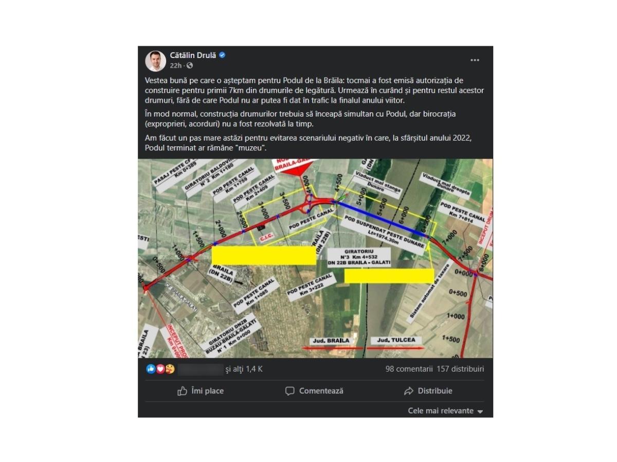 „Vestea bună pe care o așteptam pentru Podul de la Brăila: tocmai a fost emisă autorizația de construire pentru primii 7km din drumurile de legătură. Urmează în curând și pentru restul acestor drumuri, fără de care Podul nu ar putea fi dat în trafic la finalul anului viitor. În mod normal, construcția drumurilor trebuia să înceapă simultan cu Podul, dar birocrația (exproprieri, acorduri) nu a fost rezolvată la timp. Am făcut un pas mare astăzi pentru evitarea scenariului negativ în care, la sfârșitul anului 2022, Podul terminat ar rămâne «muzeu»”, a declarat Drulă.