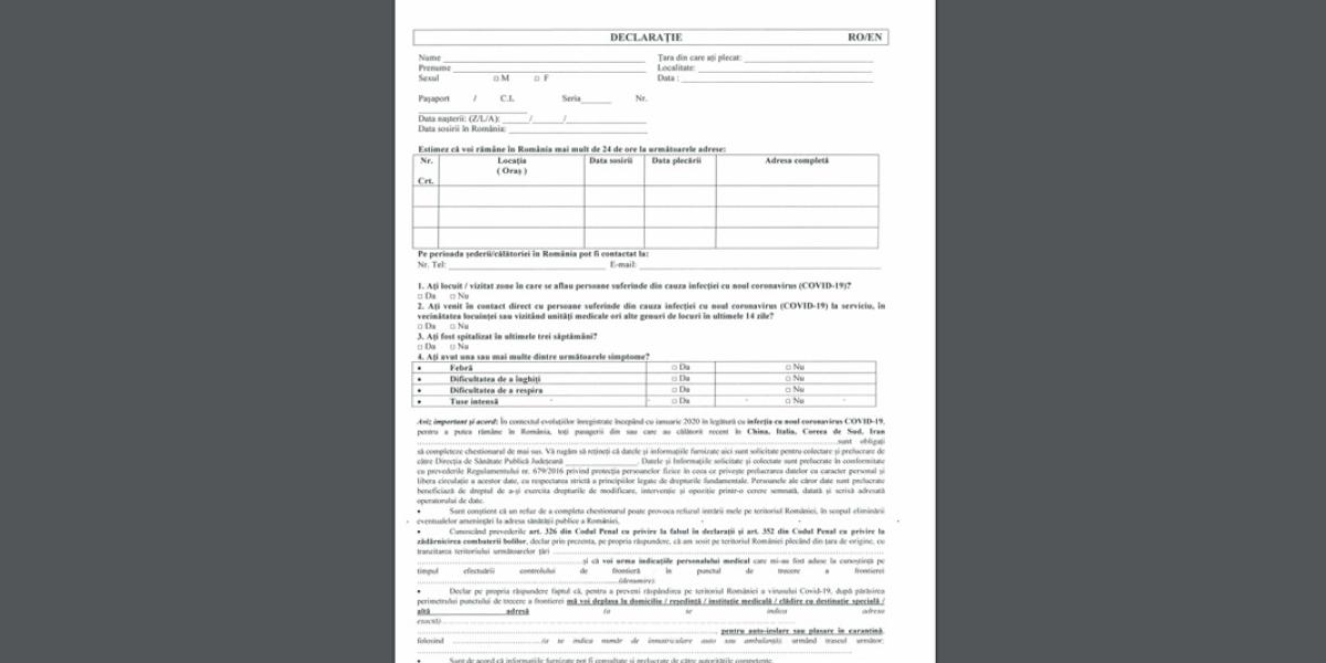 “Completarea acestei declaraţii cu date eronate intră sub incidenţa legii, conform articolelor 326 şi 352 din Codul Penal, astfel: Articolul 326 din Codul Penal - Falsul în declaraţii: Declararea necorespunzătoare a adevărului, făcută unei persoane dintre cele prevăzute în art. 175 sau unei unităţi în care aceasta îşi desfăşoară activitatea în vederea producerii unei consecinţe juridice, pentru sine sau pentru altul, atunci când, potrivit legii ori împrejurărilor, declaraţia făcută serveşte la producerea acelei consecinţe, se pedepseşte cu închisoare de la 3 luni la 2 ani sau cu amendă. Articolul 352 din Codul Penal - Zădărnicirea combaterii bolilor: (1) Nerespectarea măsurilor privitoare la prevenirea sau combaterea bolilor infectocontagioase, dacă a avut ca urmare răspândirea unei asemenea boli, se pedepseşte cu închisoare de la 6 luni la 2 ani sau cu amendă. (2) Dacă fapta prevăzută în alin. (1) este săvârşită din culpă, pedeapsa este închisoarea de la o lună la 6 luni sau amendă”, se arată într-un comunicat de presă emis de Poliţia Brăila.