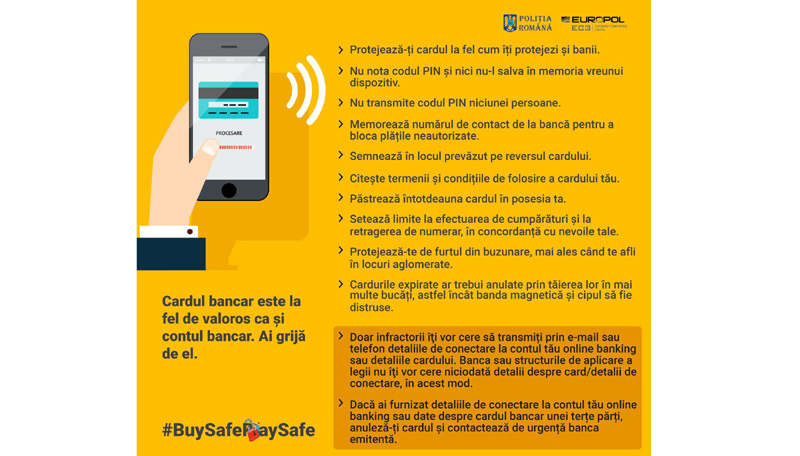 Cardul bancar nu e un simplu obiect din plastic, ci e foarte valoros, fapt ce a atras atenţia hoţilor. Poliţiştii ne avertizează că, odată cu evoluţia tehnologiei, s-au “updatat” şi infractorii, mulţi axându-se pe sustragerea banilor din conturile bancare pe care le deţinem. Campania de prevenire şi conştientizare asupra fraudelor pe internet #BuySafePaySafe este derulată la nivel European şi i s-a alăturat inclusiv ţara noastră. Se urmăreşte conştientizarea populaţiei cu privire la riscurile asociate utilizării mijloacelor electronice de plată şi transmiterea de recomandări pentru evitarea fraudelor în acest domeniu.