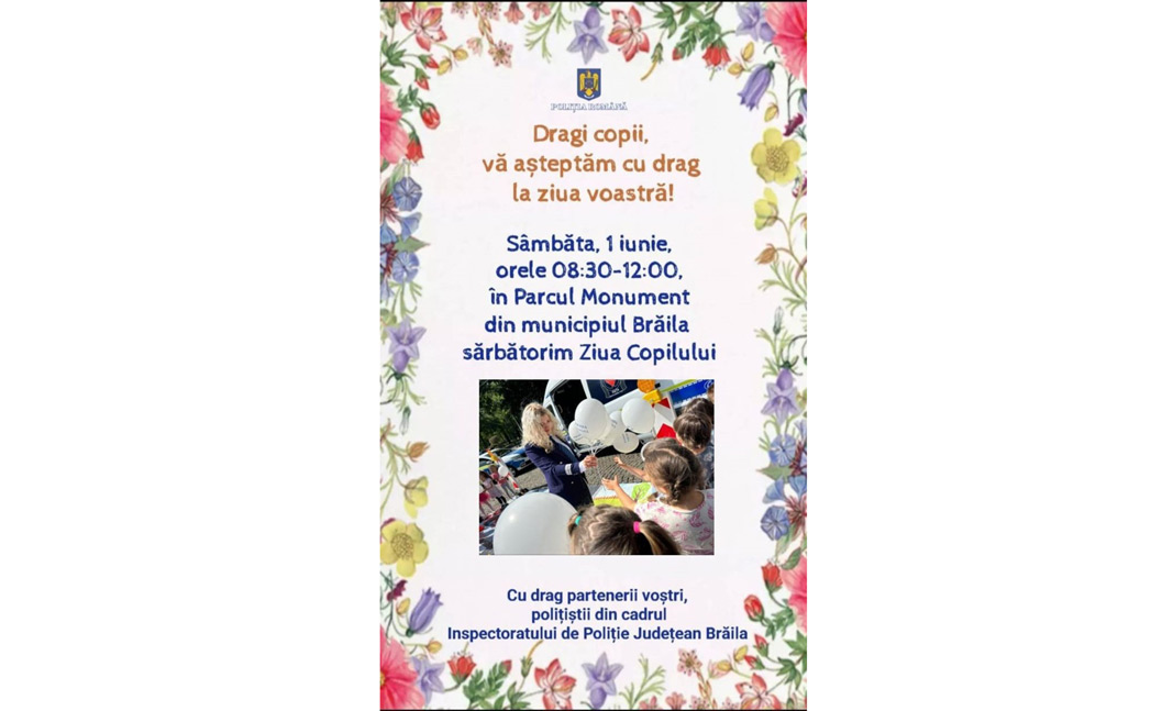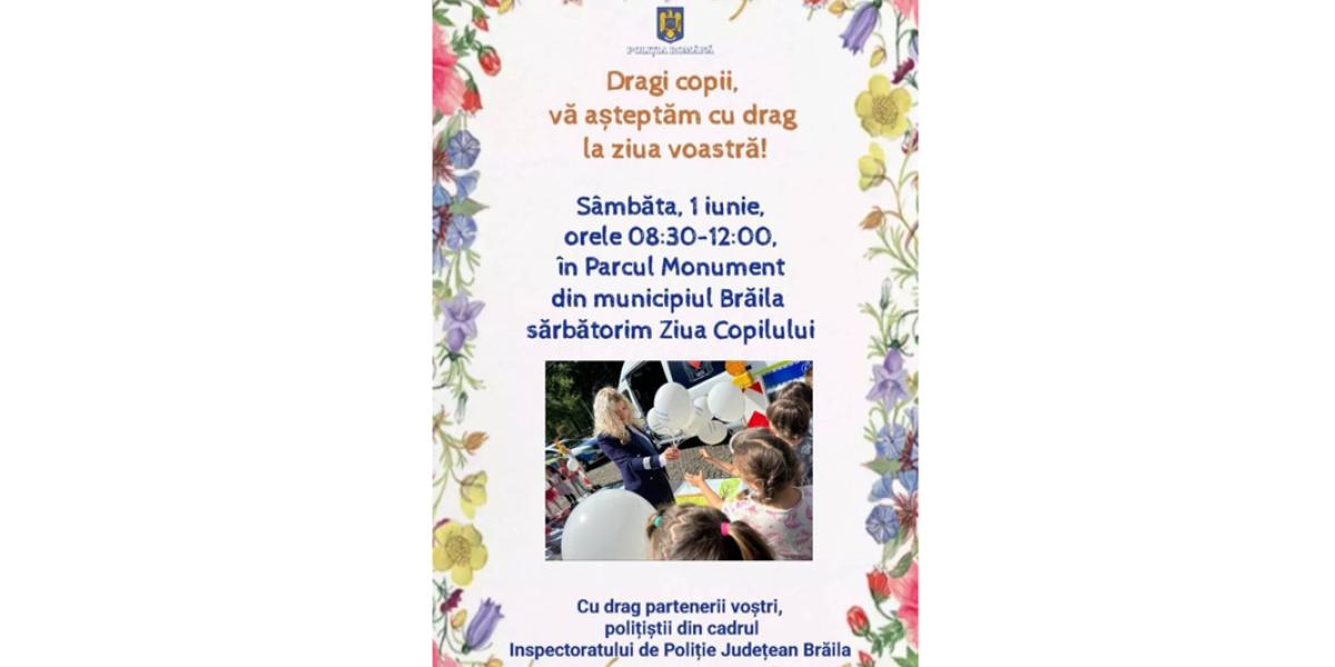 De Ziua Copilului, cei mici sunt așteptați de polițiști în Parcul Monument. Sâmbătă, între orele 8.30 și 12.00, lucrători de la Poliția Rutieră din cadrul Inspectoratului de Poliție Județean Brăila vor desfășura activități pentru copii. Pentru a marca ziua de ”1 Iunie”, polițiștii sunt alături de cei mici, cu jocuri specifice vârstei, dar și cu sfaturi pe linie rutieră, menite să îi ajute să evite unele accidente.