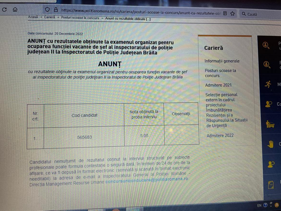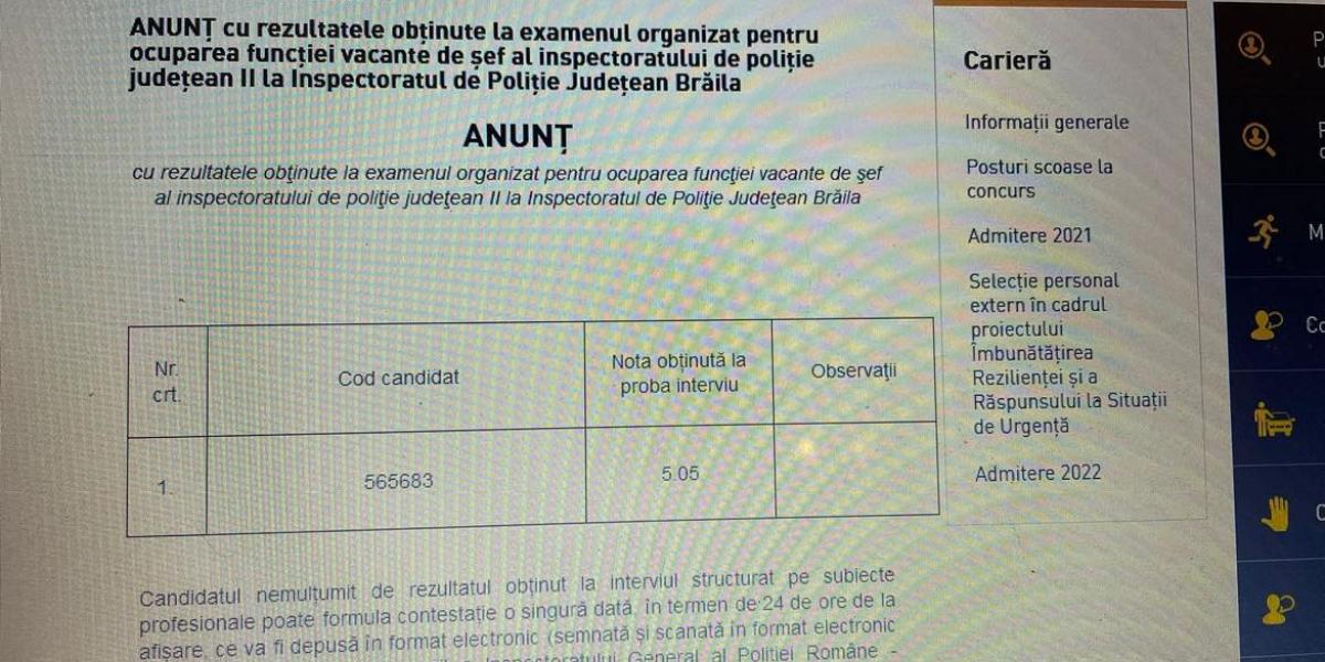 Candidatul pentru şefia Poliţiei Brăila nu a obţinut nota necesară pentru ocuparea funcţiei de conducere. Postul de șef al Inspectoratului de Poliție Județean (IPJ) Brăila a fost scos la concurs, iar proba pentru ocuparea funcției vacante a fost susținută marți, 20 decembrie. Din datele pe care le deținem, cel înscris pentru ocuparea postului de conducere este actualul șef provizoriu al IPJ Brăila, Marius Budu, împuternicit pe funcție. După cum se arată pe site-ul Poliției Române, acesta a obținut nota 5.05, minimul care trebuia obținut pentru promovare fiind 7, ceea ce înseamnă că Poliția Brăila rămâne tot fără inspector șef. Pe site Poliţia Română nu apare nume al candidatului, ci doar un cod.